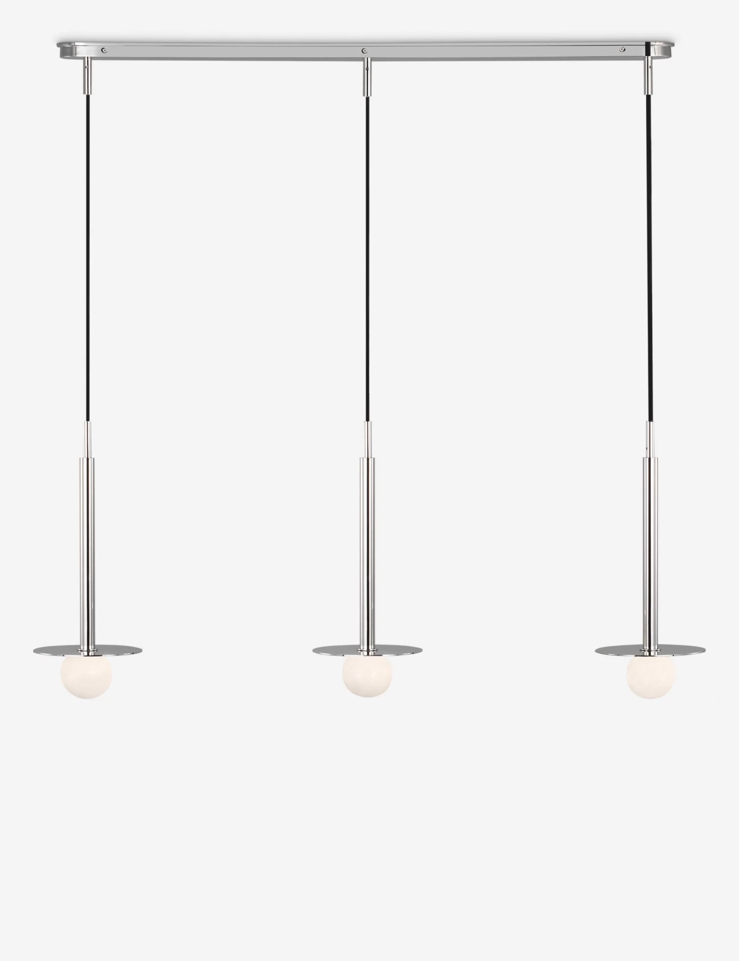 Kelly Wearstler possesses an intuitive eye for finding harmony through contrast, creating richly layered spaces and thoroughly refined elements for the home. The renowned designer brings her evocative style to lighting with the Nodes linear pendant. This sleek hanging light strikes statement appeal overhead with milk glass globes and removable disk canopies.