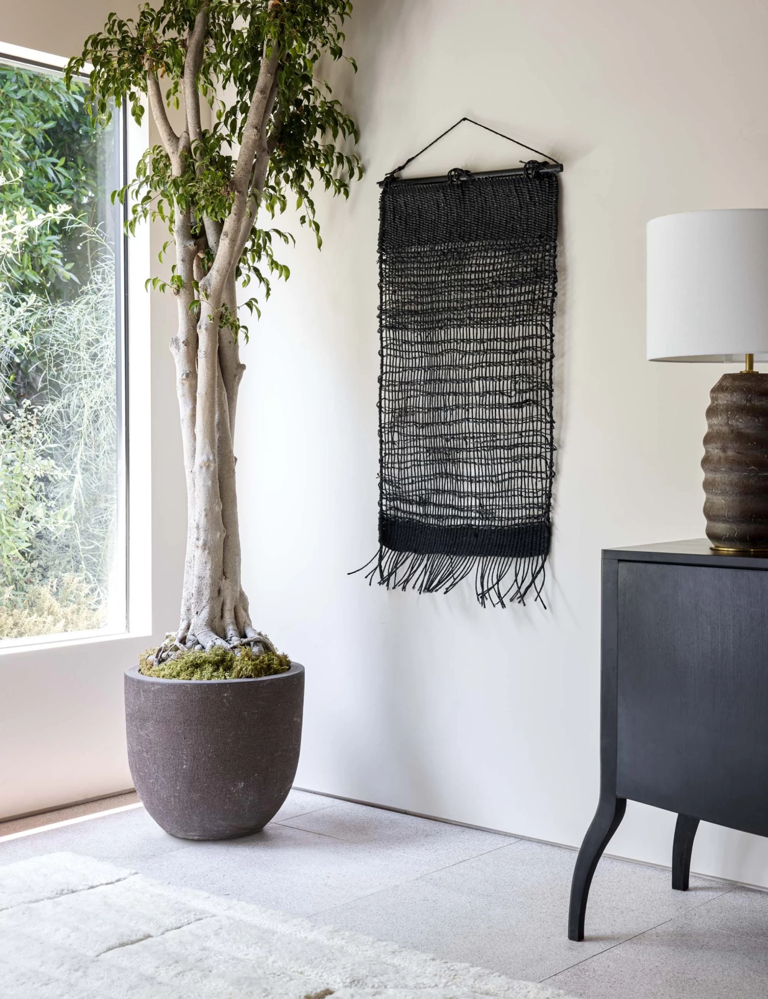 Woven with natural jute and hemp fibers this wall hanging is a meditation on organic elegance. Its broad design will instantly add a rich tactile presence to your wall decor.