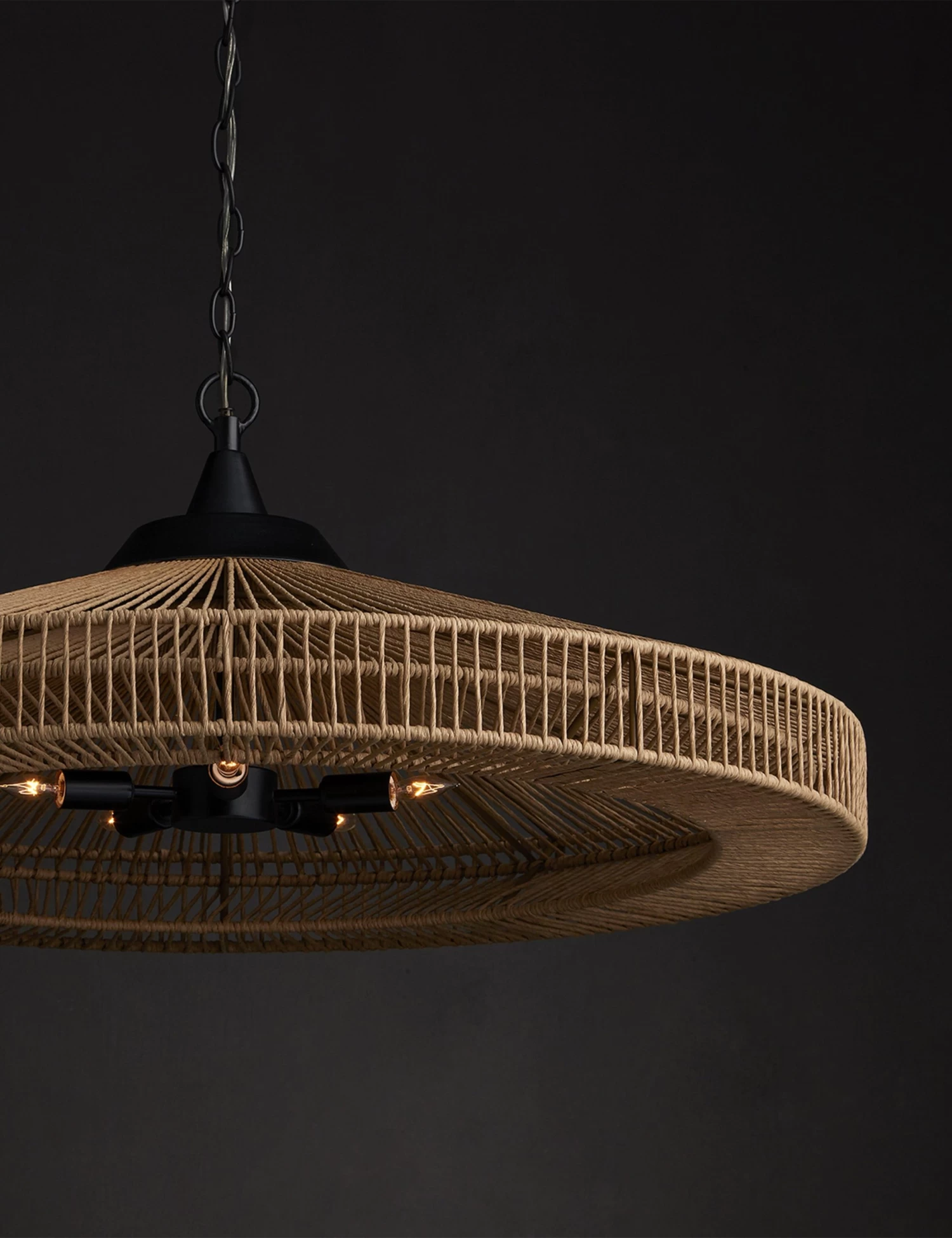 The Oleander chandelier offers a raw, textural quality elevated with an intricate artisanal design. The woven frame creates visual intrigue overhead, fashioning this large chandelier for statement appeal. The nested shade diffuses the light for warmth and ambiance in the room.