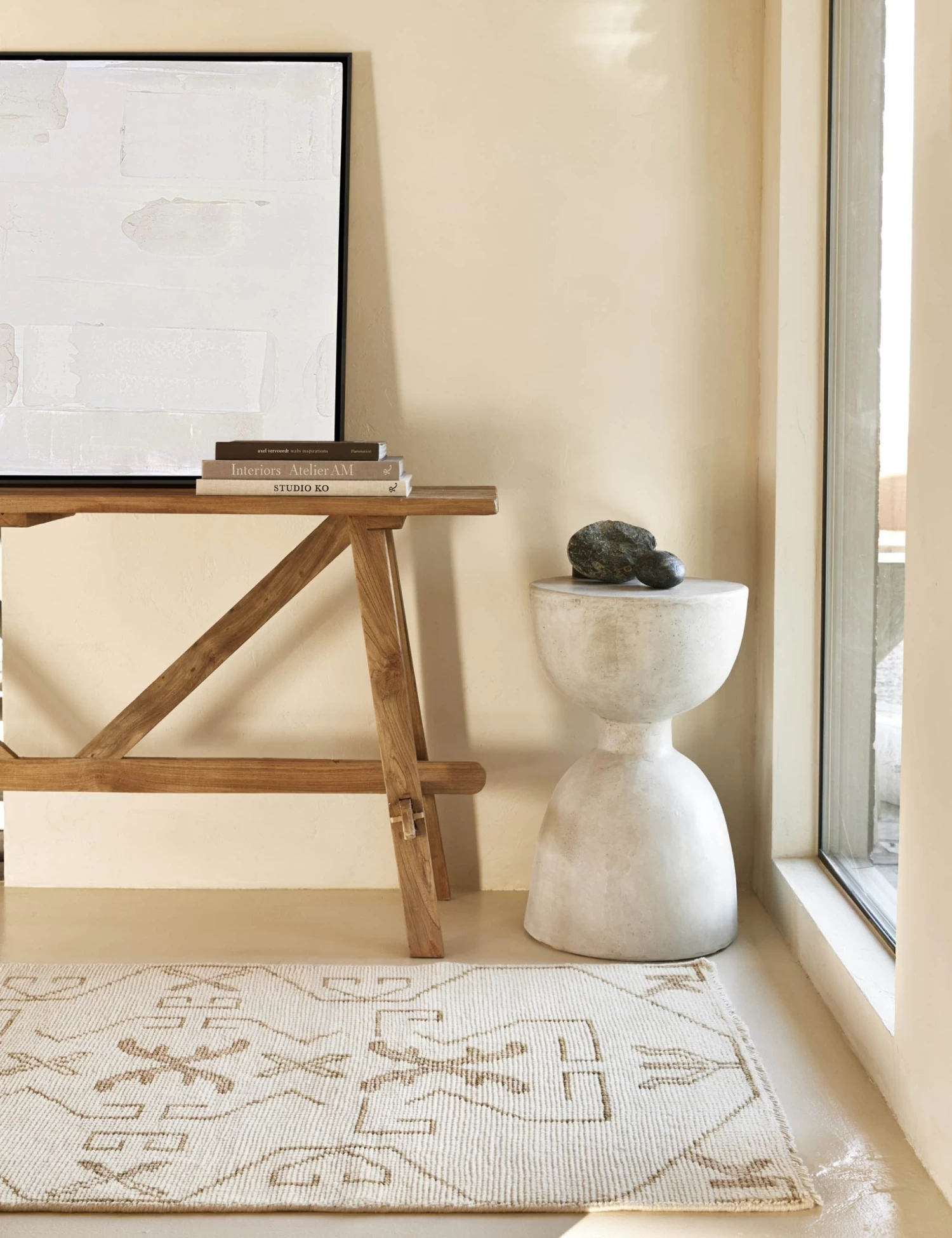 Light neutral hues make this original work of hand-painted art understated and versatile, while variations in brushstrokes create texture and depth. Its tonal palette and simplicity adds the perfect touch to any minimalistic or modern space.