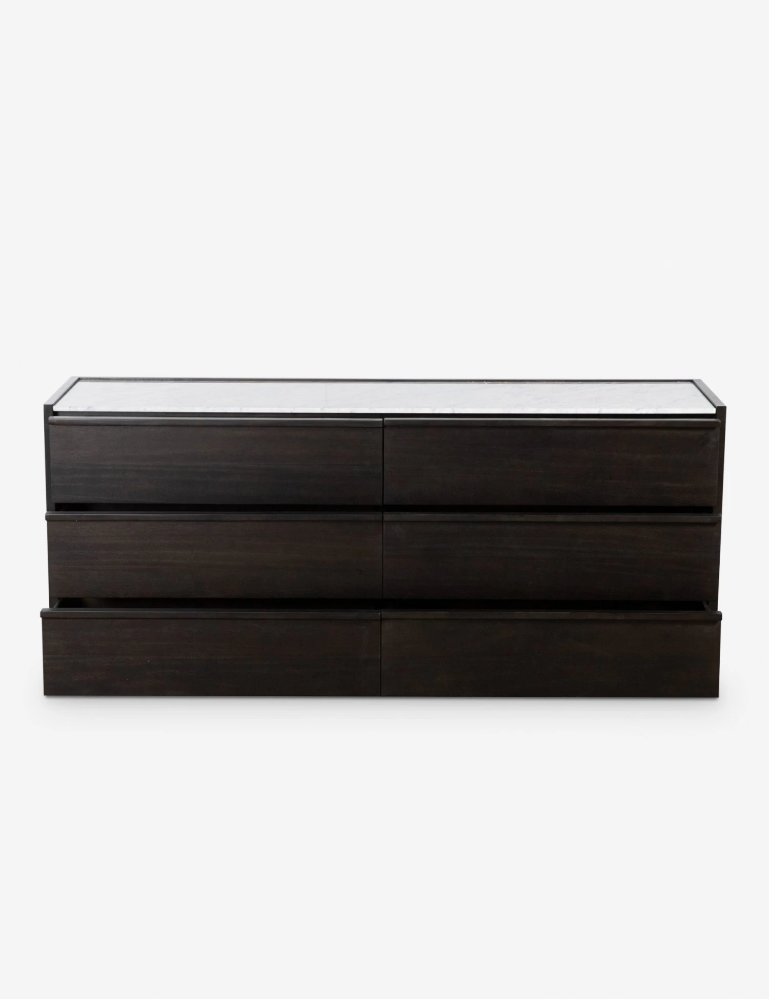 Bring the cool touch of white marble to your bedroom with this luxe dresser. Clad in a dark acacia veneer to offer tonal contrast to its stone top, this wide dresser features six spacious drawers for a standout storage piece that will elevate your bedroom look.