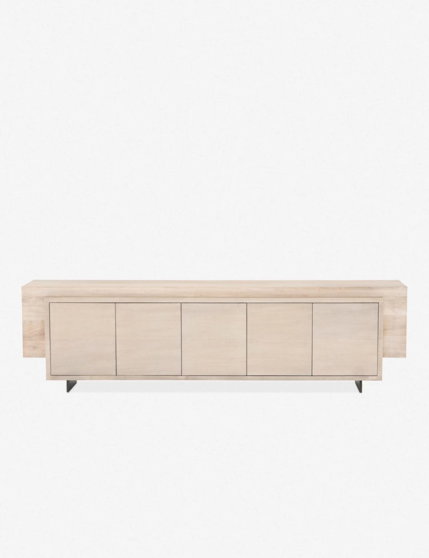 Inspired by stately Italian design, the exaggerated silhouette of this media console offers room-defining style. Its blonde-finished walnut veneer case seemingly floats atop its blackened iron legs, with pale oak veneer door fronts adding rich definition. A spacious interior comes with shelving to offer plenty of room for media storage as well as rear cutouts.