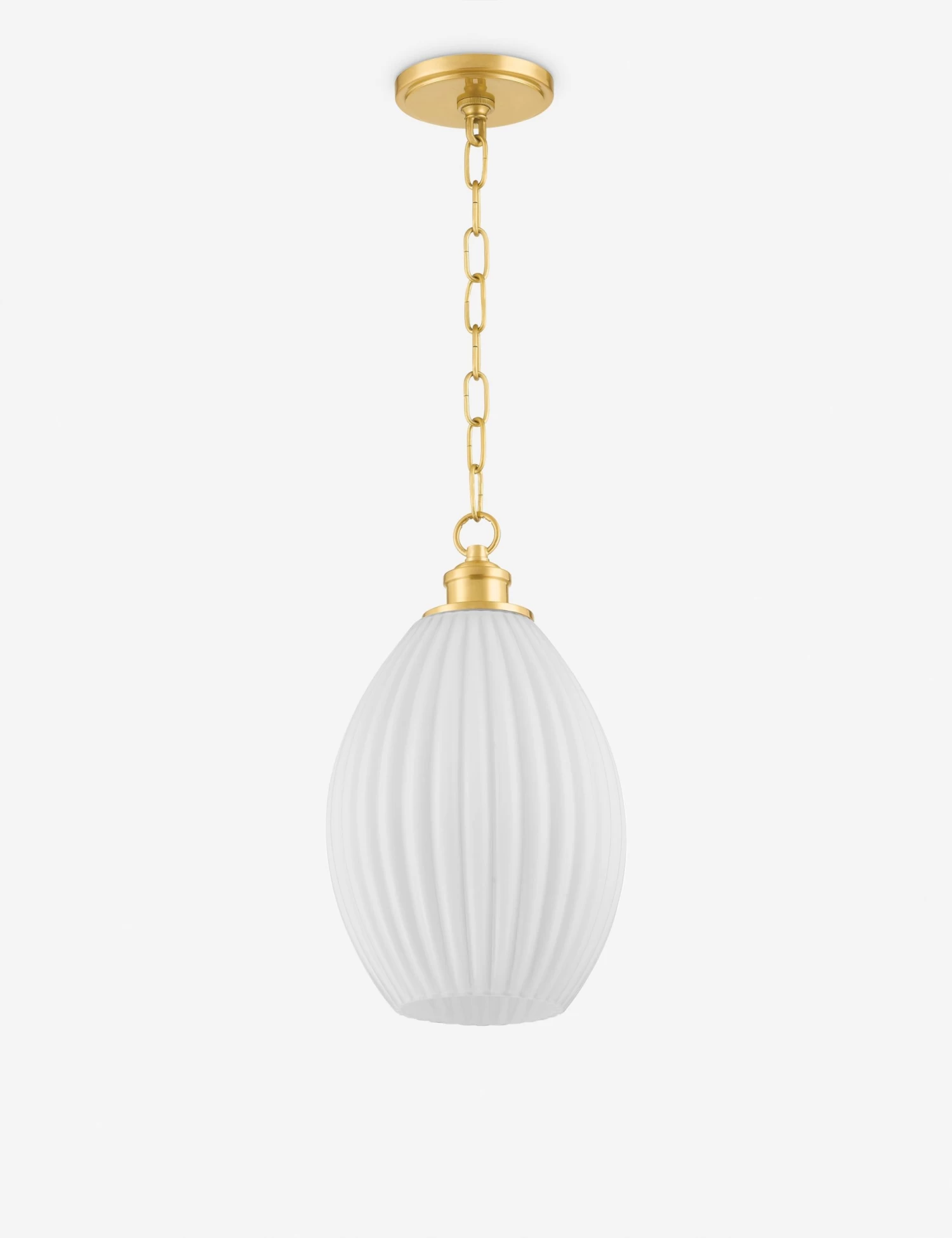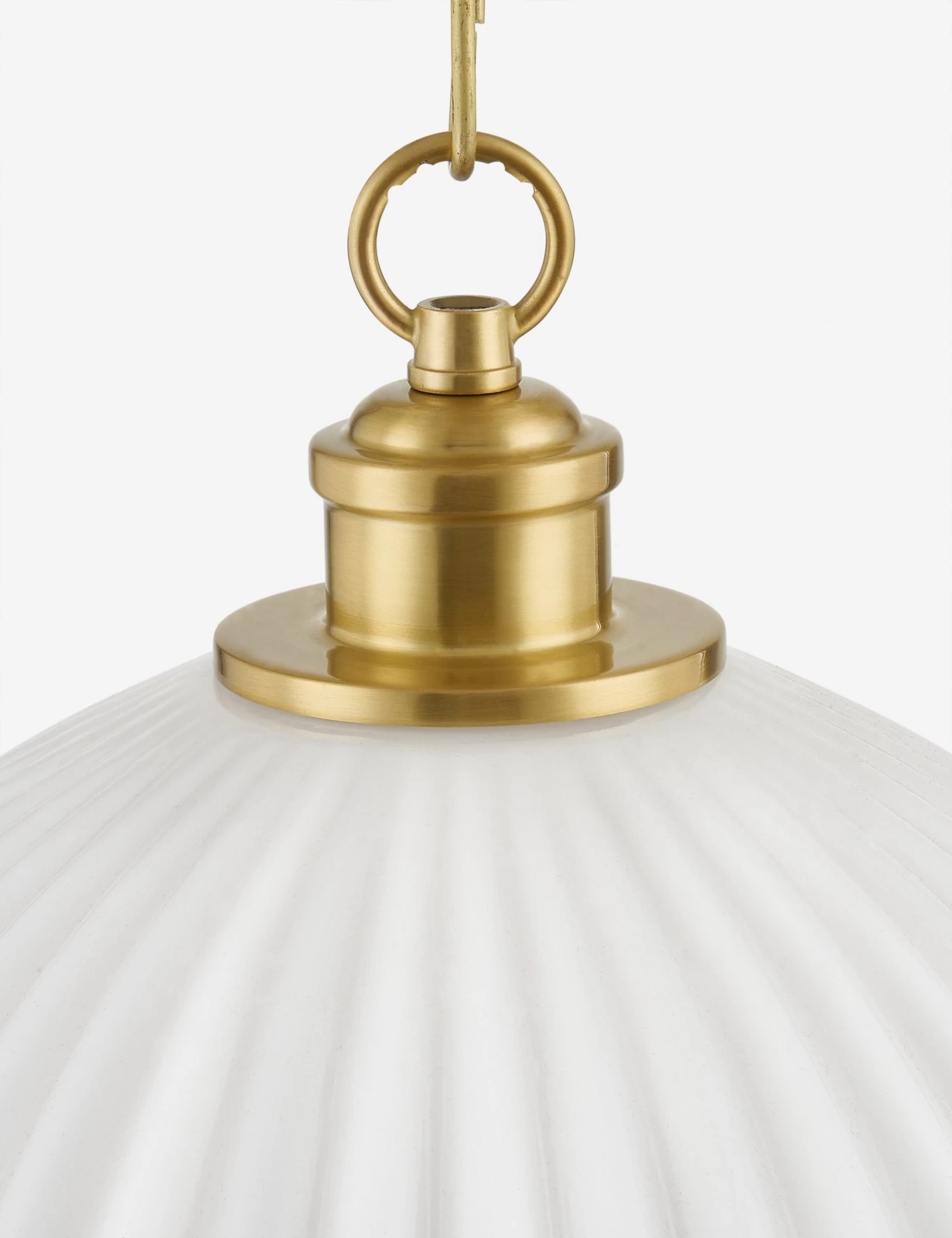 The Parvati pendant brings cottage charm to modern lighting design with a beautiful blend of the new and old. The fluted glass shade is suspended from a metal chain—finished to suit your look. Make a standout statement in your entryway or lounge, or hang this pendant light in pairs for your kitchen or dining room.