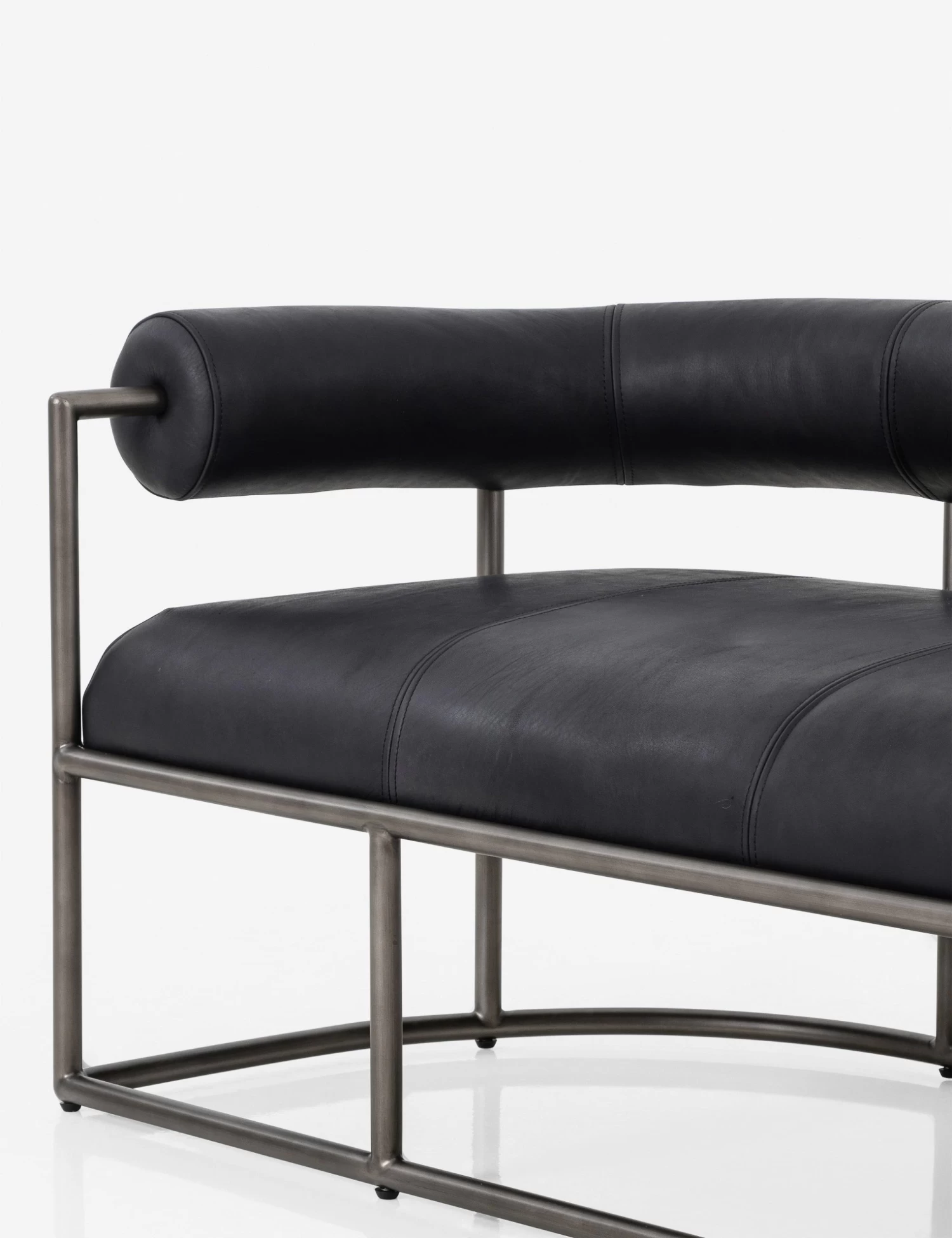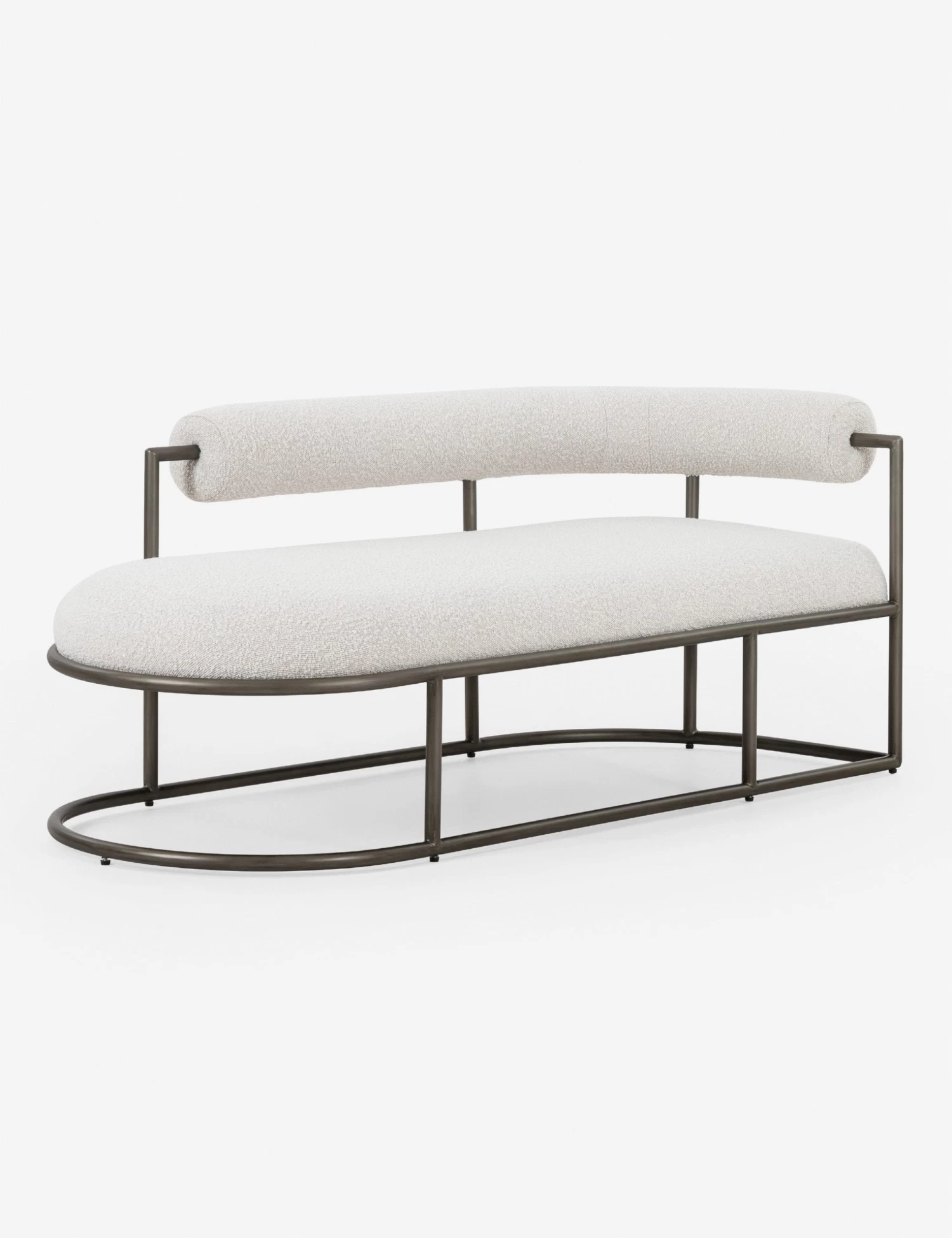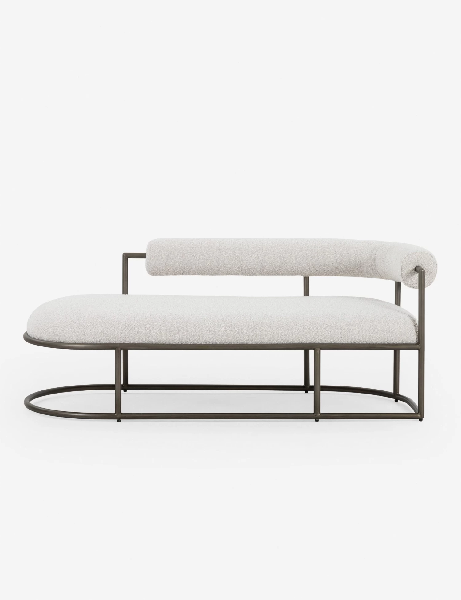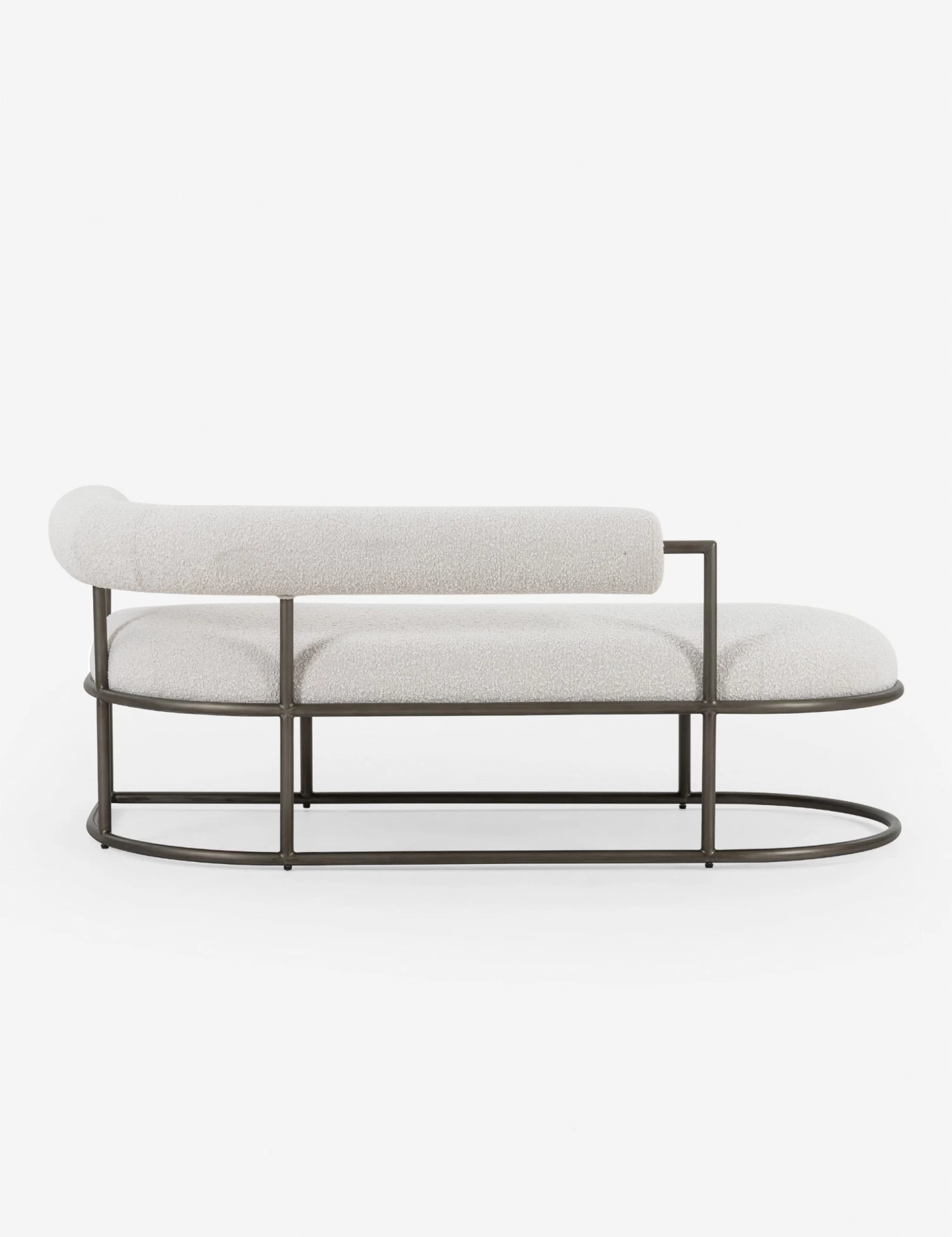 A slate-brushed iron frame and curved chaise-like design are finished in a durable fabric made to mimic the soft texture of boucle in a light neutral tone that will fit most spaces. This streamlined chaise is an ideal way to add some elevated, cozy seating to an airy or transitional space.
