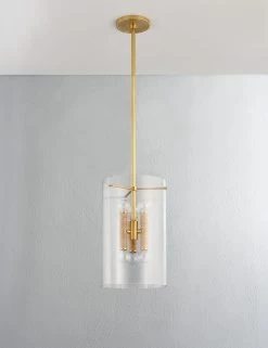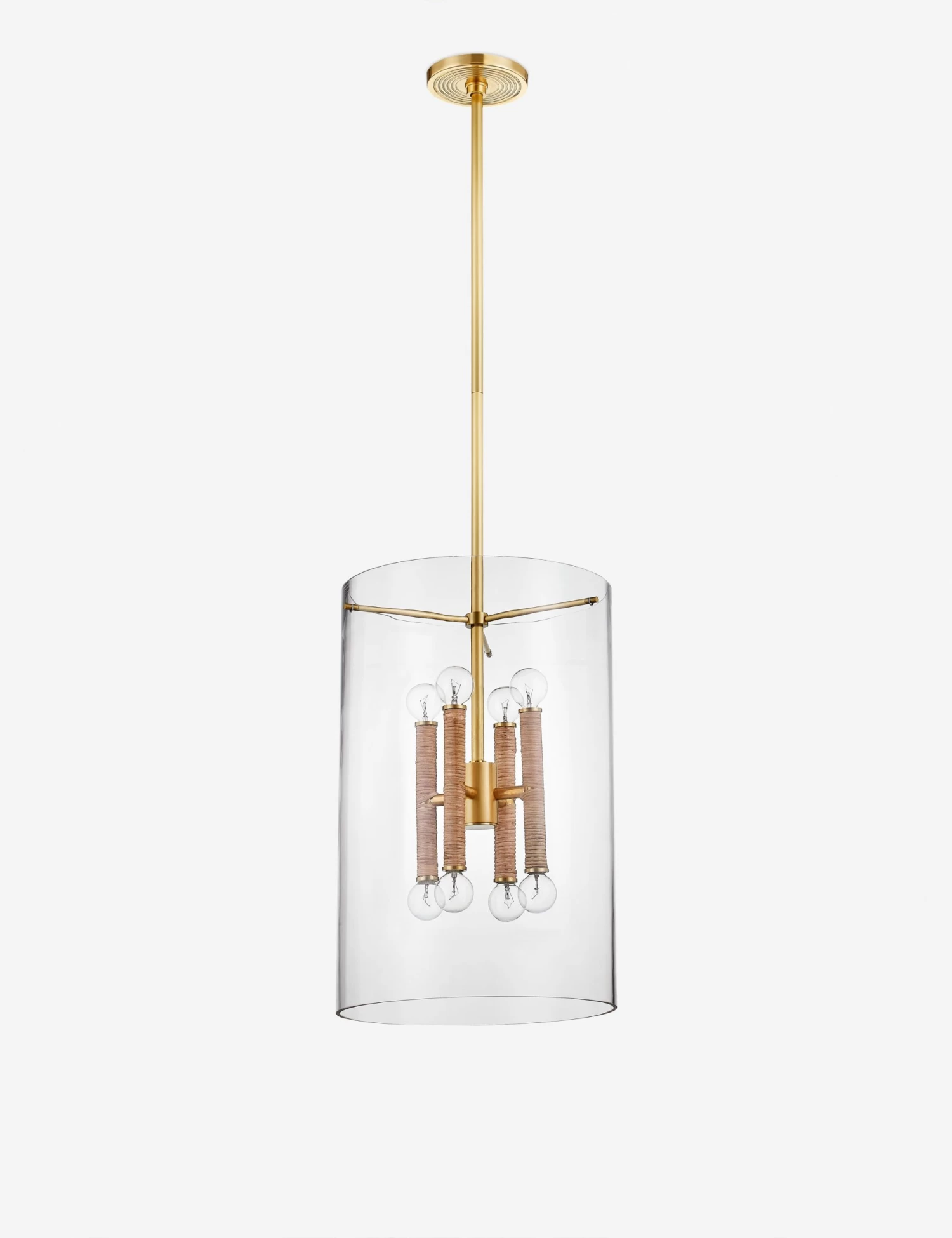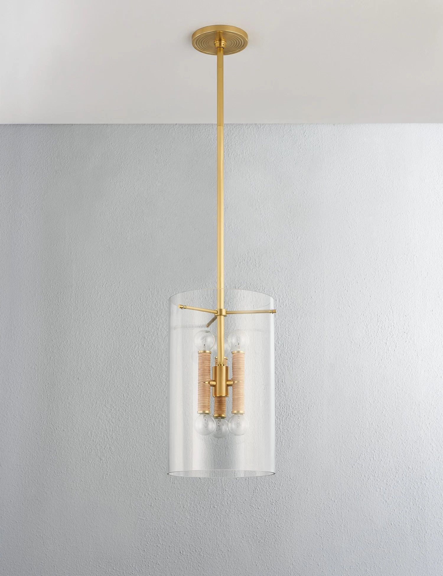 Mixed material design brings endless charm to the Percy pendant light. The cylindrical glass shade showcases brass-finished candlestick fixtures wrapped in rattan, offering bright ambient light in a lantern-style pendant.