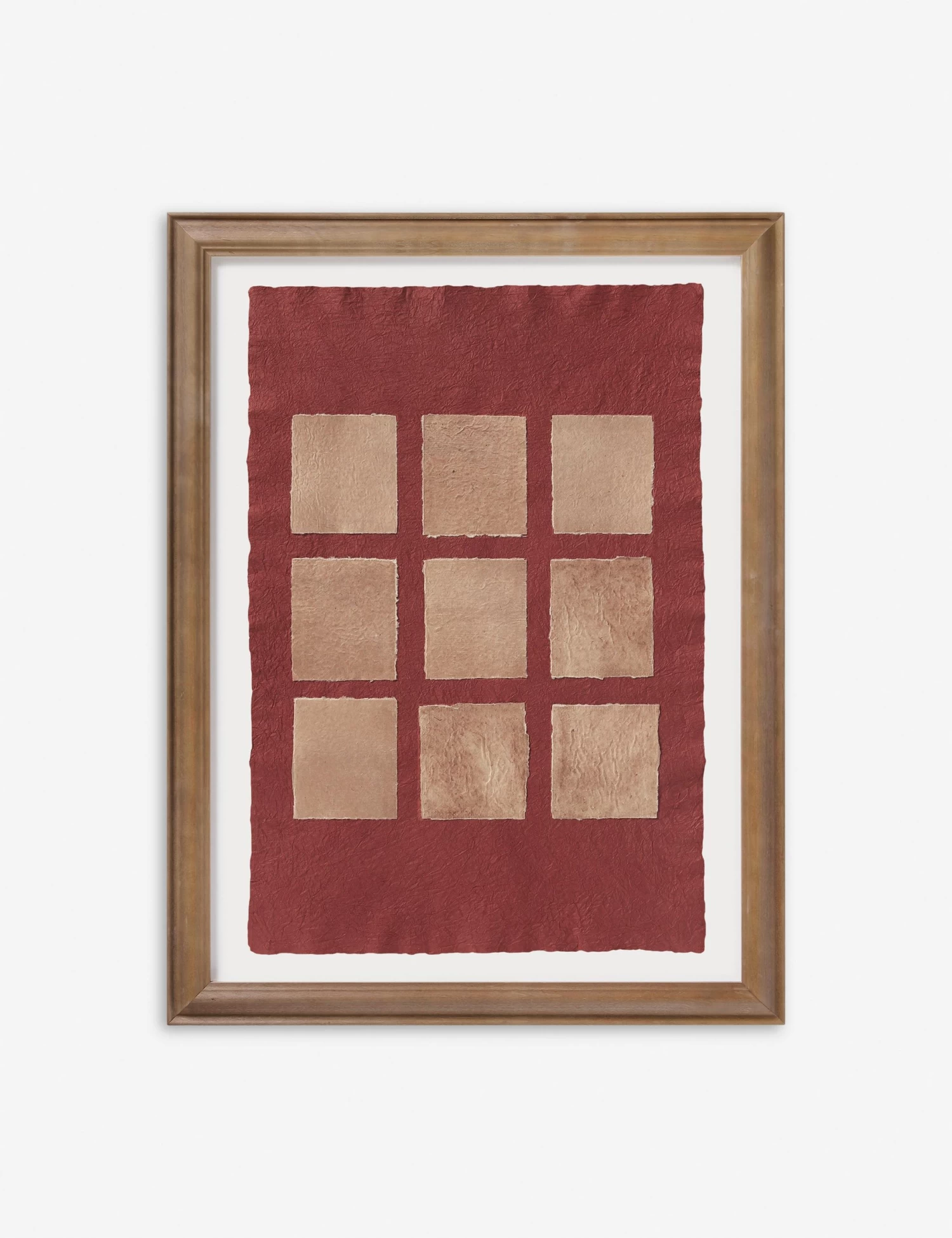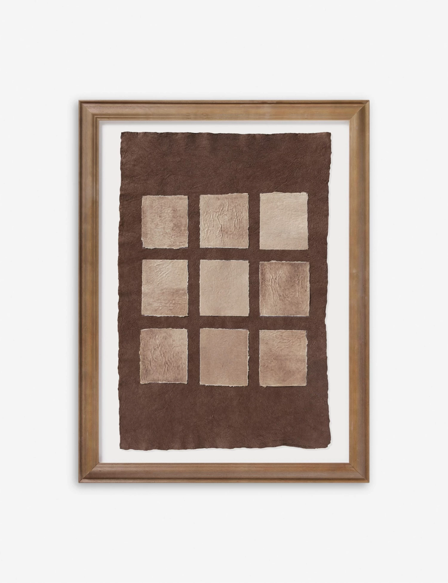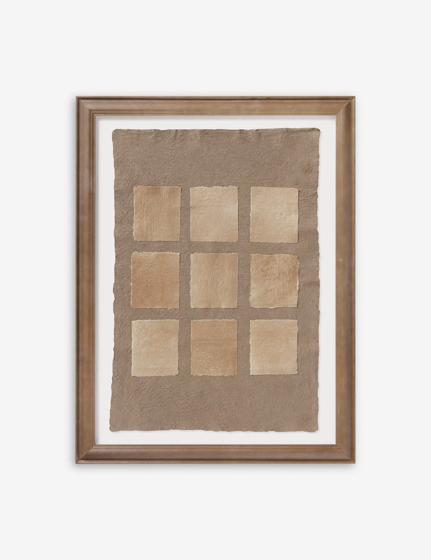 Phobos features a textured composition with handmade paper layered into a tonal collage. The minimalist composition is floated in a light walnut frame to set off the grounding palette with quiet impact. Style this artwork on its own to bring a fresh dimension to modern wall decor.