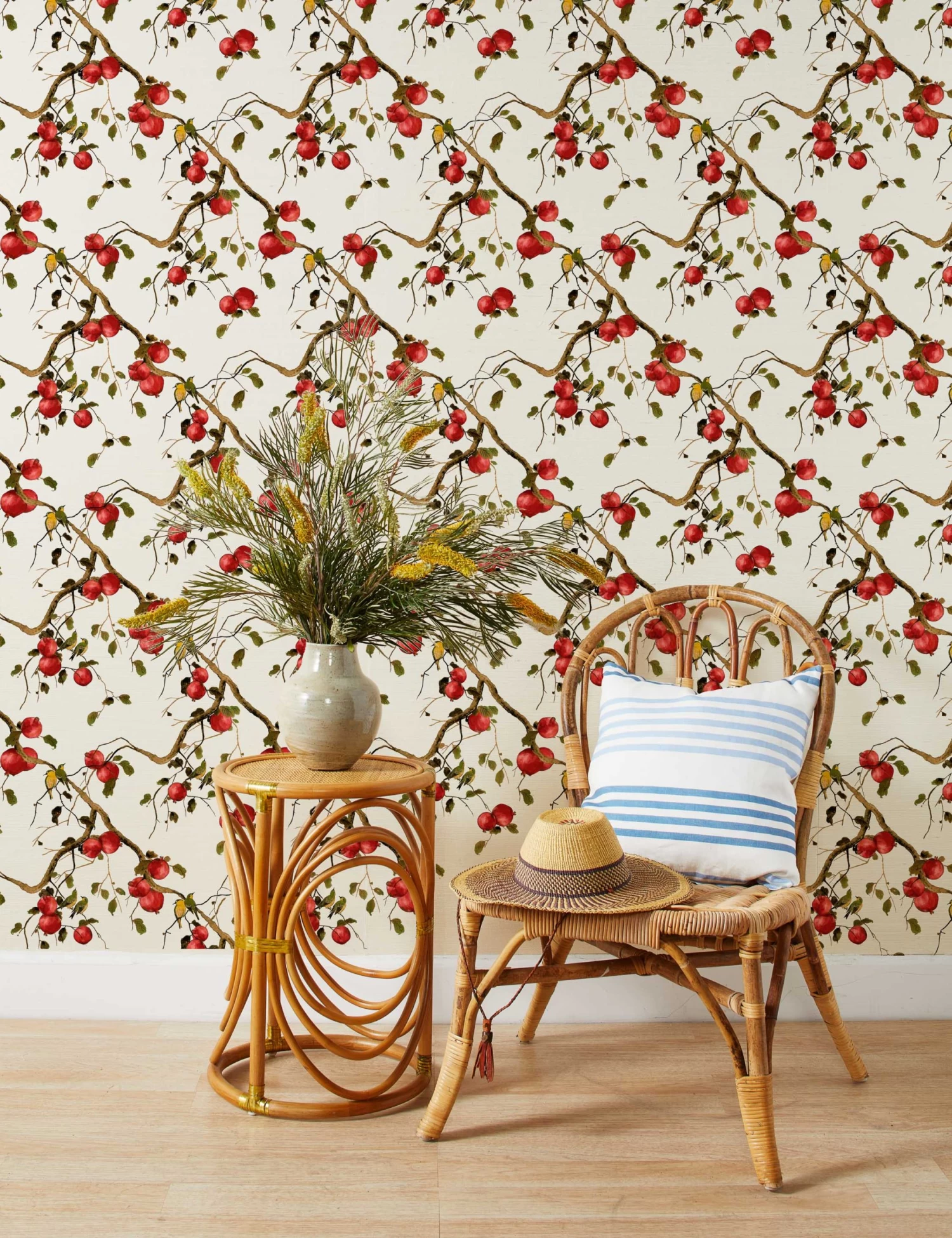 An intricate illustration full of detail and colorful moments inspires this delicate home wallpaper design. In this pattern, pomegranates burst out in beautiful red hues, complemented by yellow and green birds perched throughout. This woven grasscloth wallpaper is perfect for bringing timeless sophistication into a dining nook or bedroom.