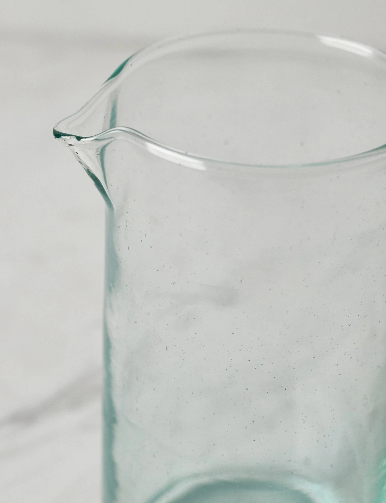 Made in collaboration with Moroccan artisans, this handmade glassware is crafted with recycled glass for a unique tint, subtle bubbling, and tapered profile that varies slightly from piece to piece for a bespoke touch. This pitcher is the perfect complement to your drinkware collection and the ideal size to offer the table water or share a cocktail.