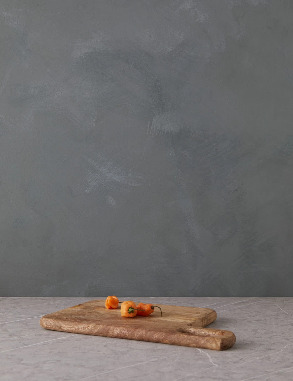 A rustic cutting board with a stylish edge for chopping, slicing, and prepping counter-to-table bites when entertaining. The open handle design is great for hanging storage, adding natural texture and practical appeal to your kitchen wall decor.