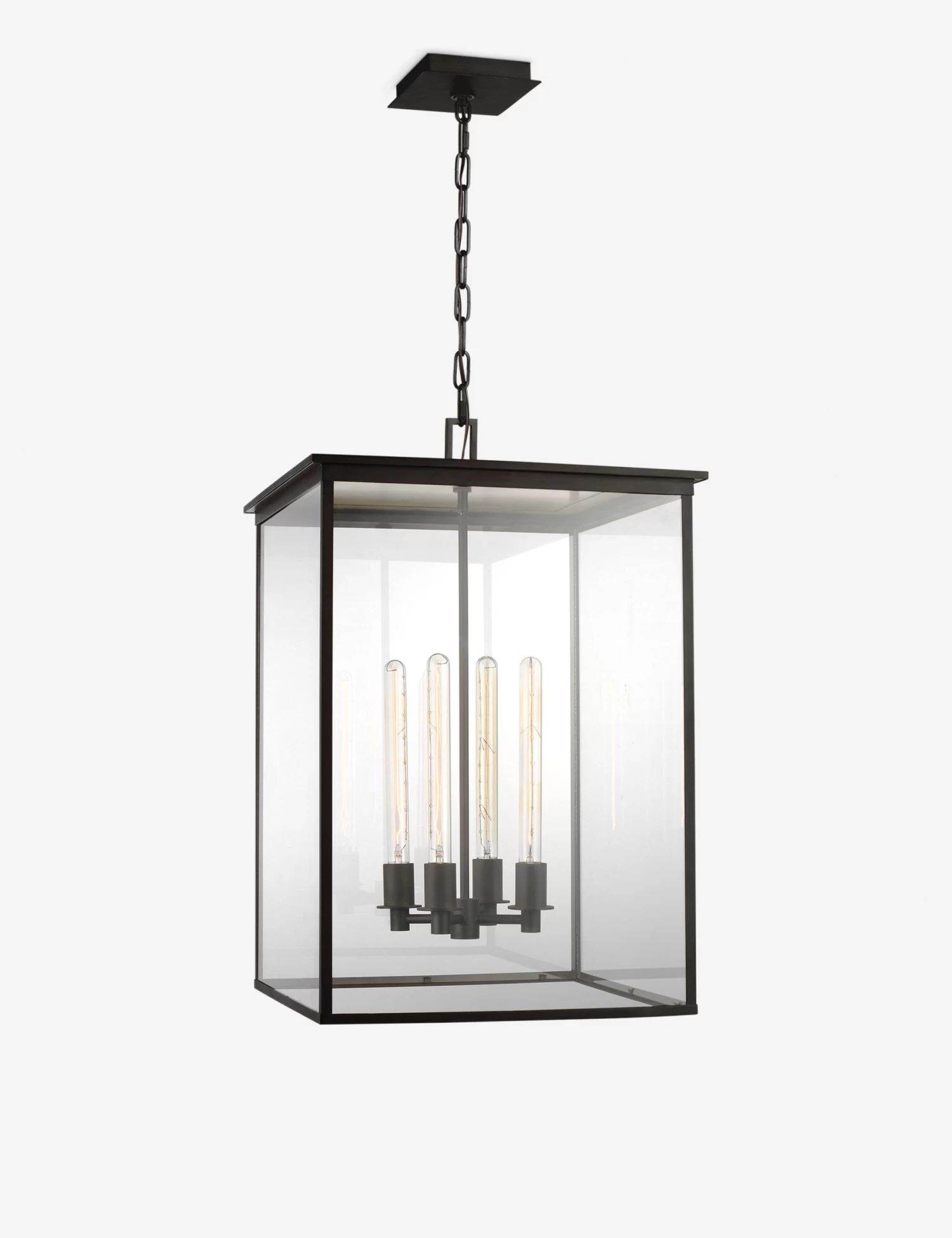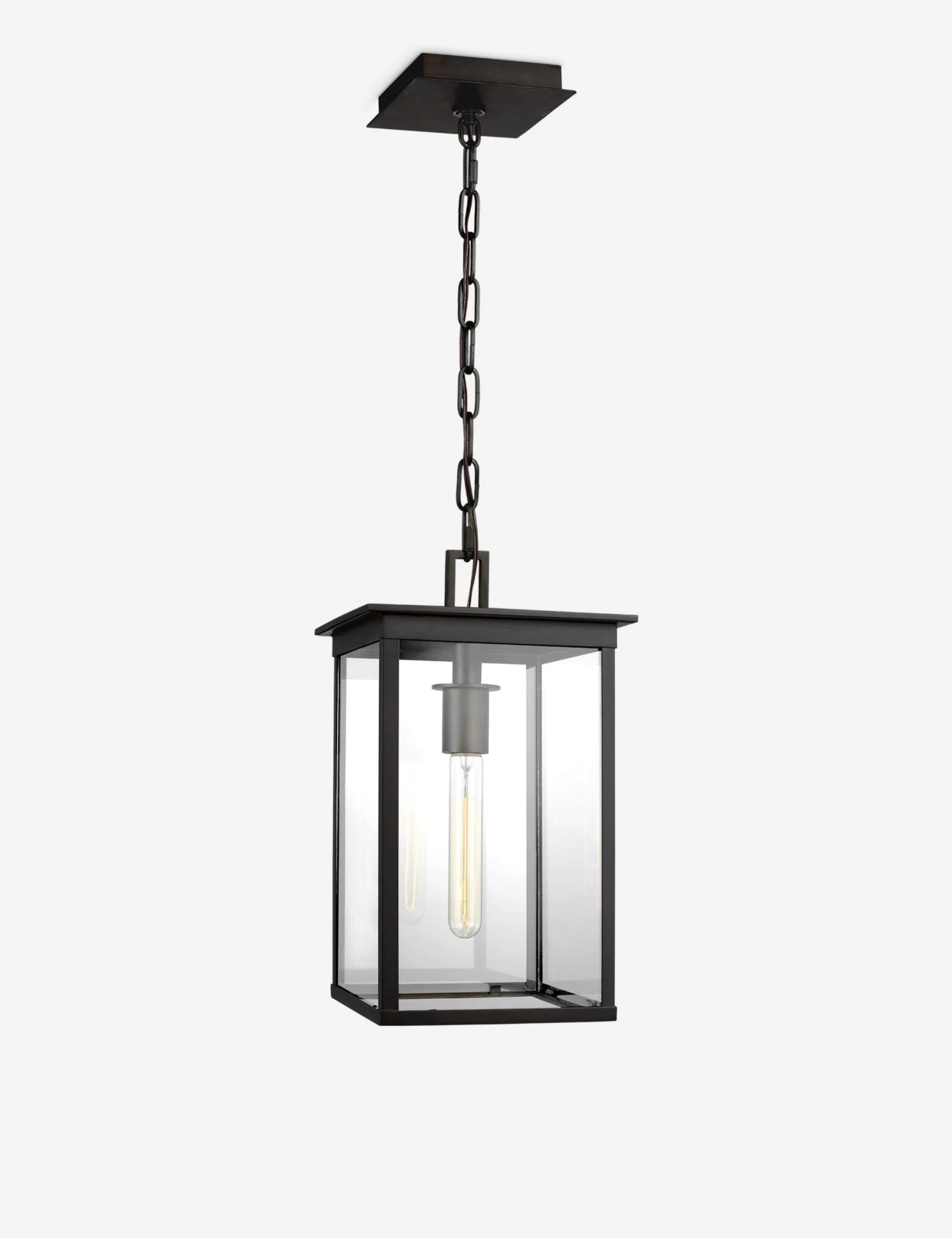 Framed in black metal and fitted with clear glass, Romary balances clean lines with industrial undertones. With its chain suspension and visible bulbs, this handing light brings timeless warmth and ambiance with a tailored edge to your space. We love this outdoor pendant for elevating a covered porch or patio with a refined lighting feature.