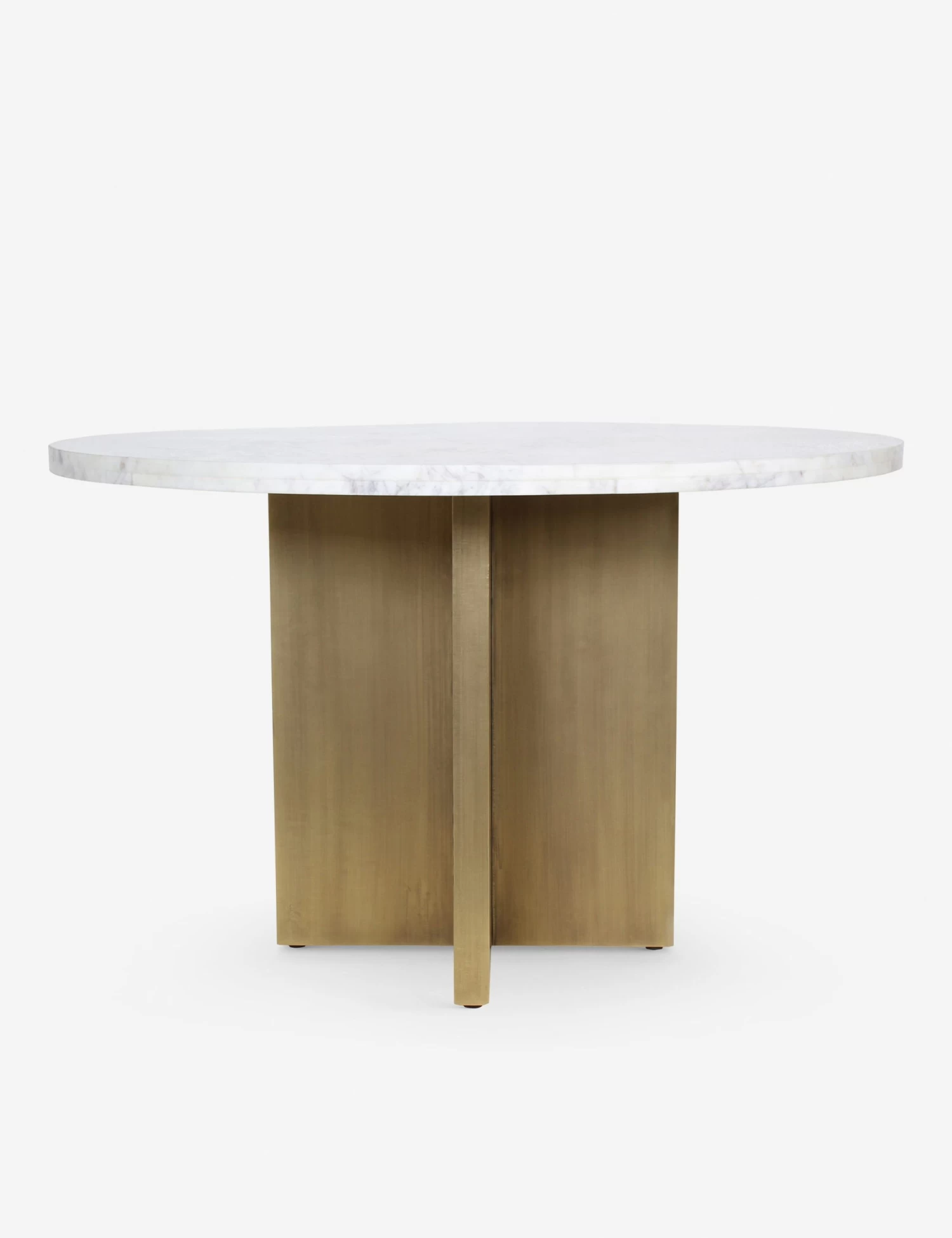 Rowell brings luxe materials and a striking silhouette to the intimacy of a round dining table design. Its marble top sits on a sectioned iron base in a bold brass finish—the perfect table to make a statement in small-space dining.