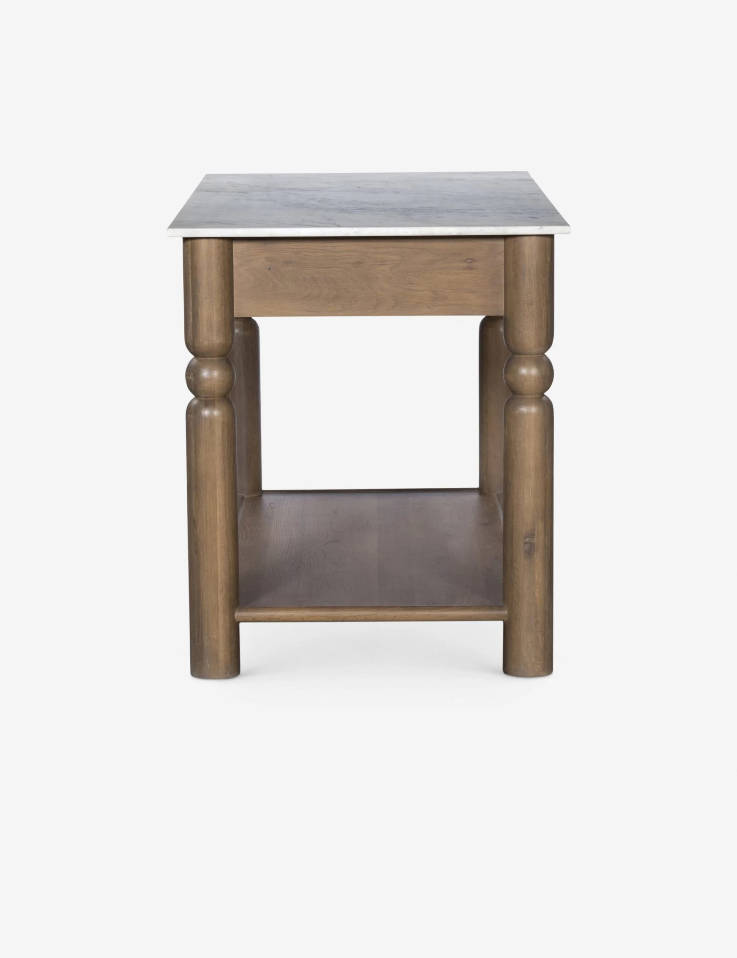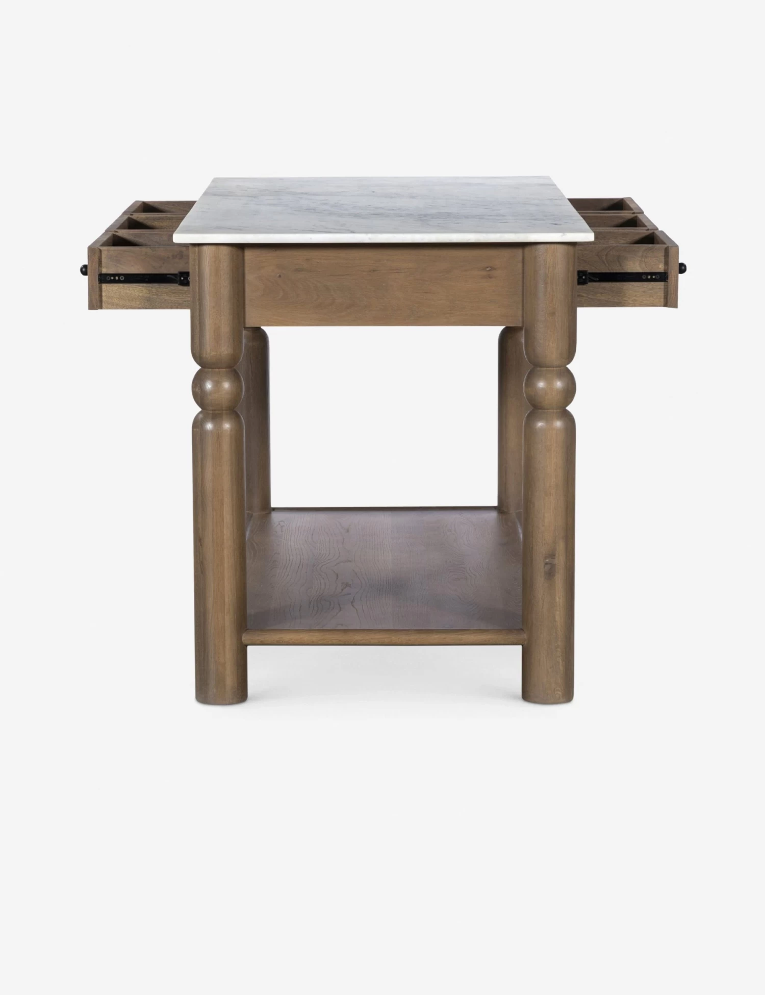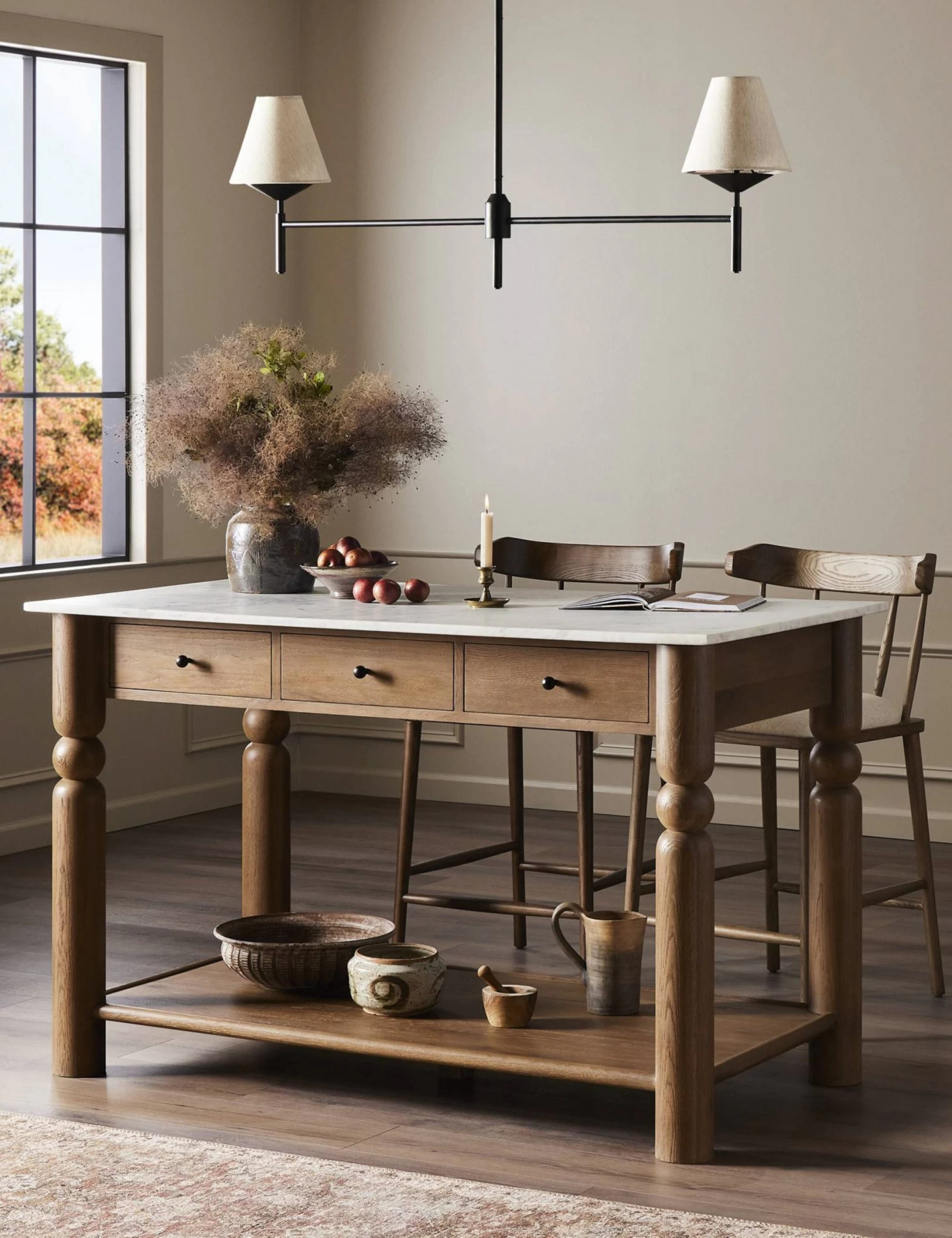 Looking for more from your kitchen? Don’t settle for simple surface space—style it with a statement. This island transforms the flow of your room with a spot to sit for social cooking and casual meals or extra counter space for ambitious weekend bakes. The marble top and turned oak legs cut a timeless silhouette with three drawers and a lower shelf for ample kitchen storage.