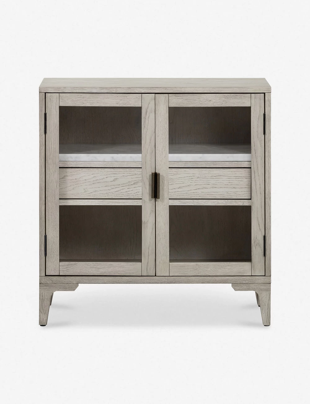 A white oak veneer makes for a simple yet sturdy nightstand, ideal for a light and airy space. The glass doors, open shelving, and marble-topped drawer offer this unique bedside table plenty of storage and an eye-catching display.