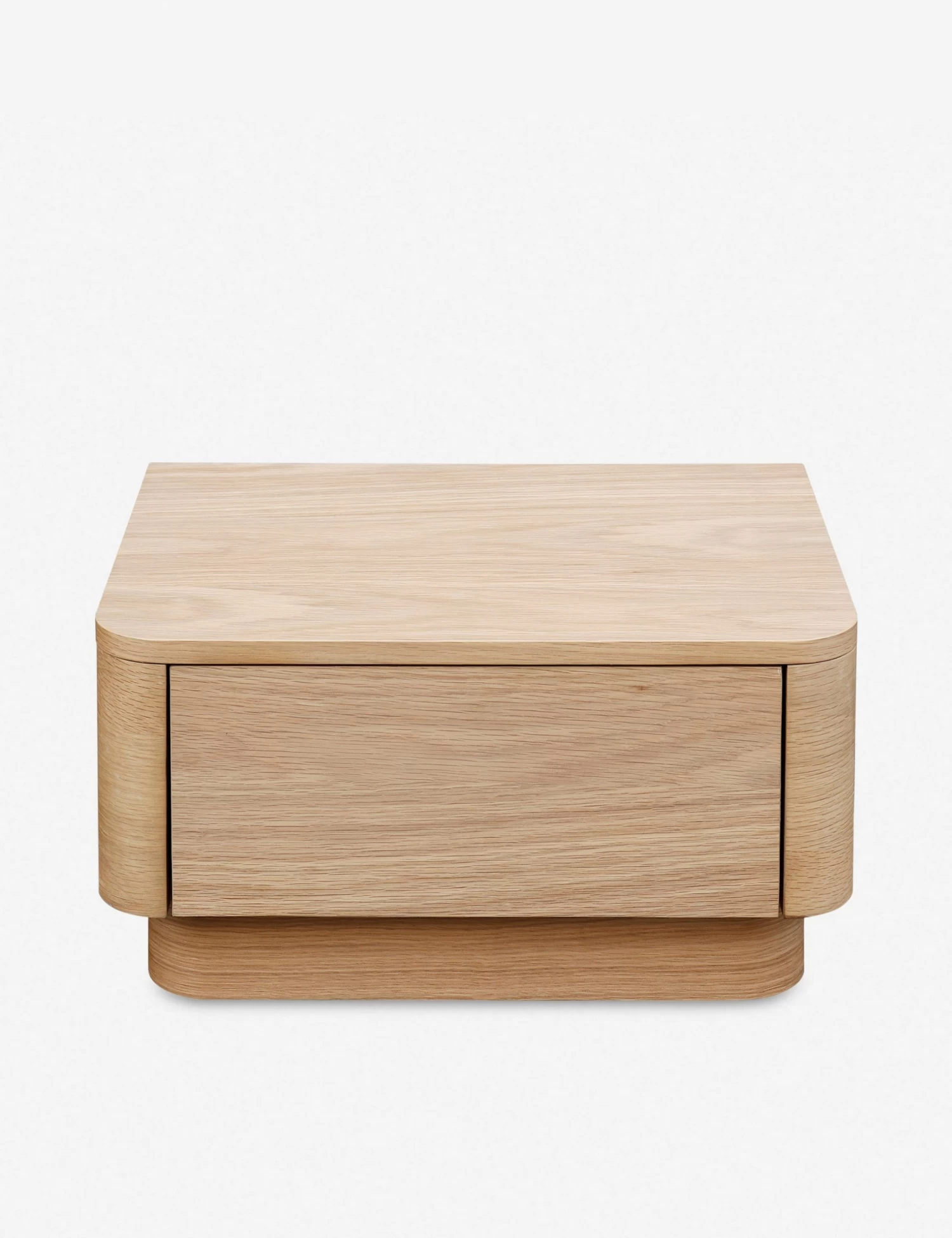 A minimalist nightstand from the Ryland Collection featuring solid oak construction with softly molded corners and a low-slung design. Clean, gentle lines and a sleek wood grain are highlighted by a light, natural finish for a look that is understated and refined. Set on a plinth-style base, a single drawer opens to spacious storage in this streamlined bedside table.