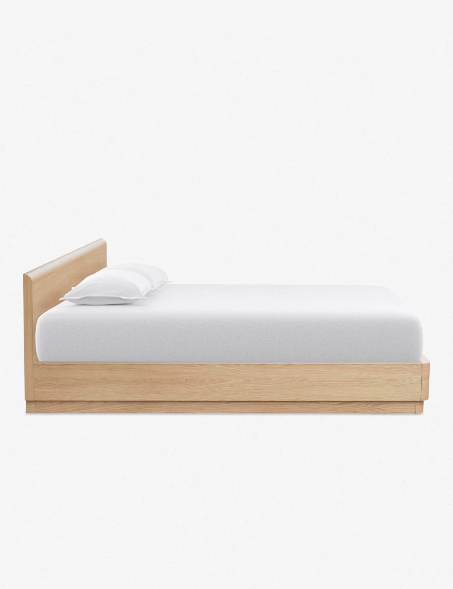 A beautiful platform bed from the Ryland Collection featuring solid oak construction with softly molded corners and a low-slung design. Clean, gentle lines and sleek wood grain are highlighted by a light, natural finish for a look that is understated and refined. This plinth base bed frame with headboard offers a sturdy silhouette that will ground your bedroom with a modern tone.