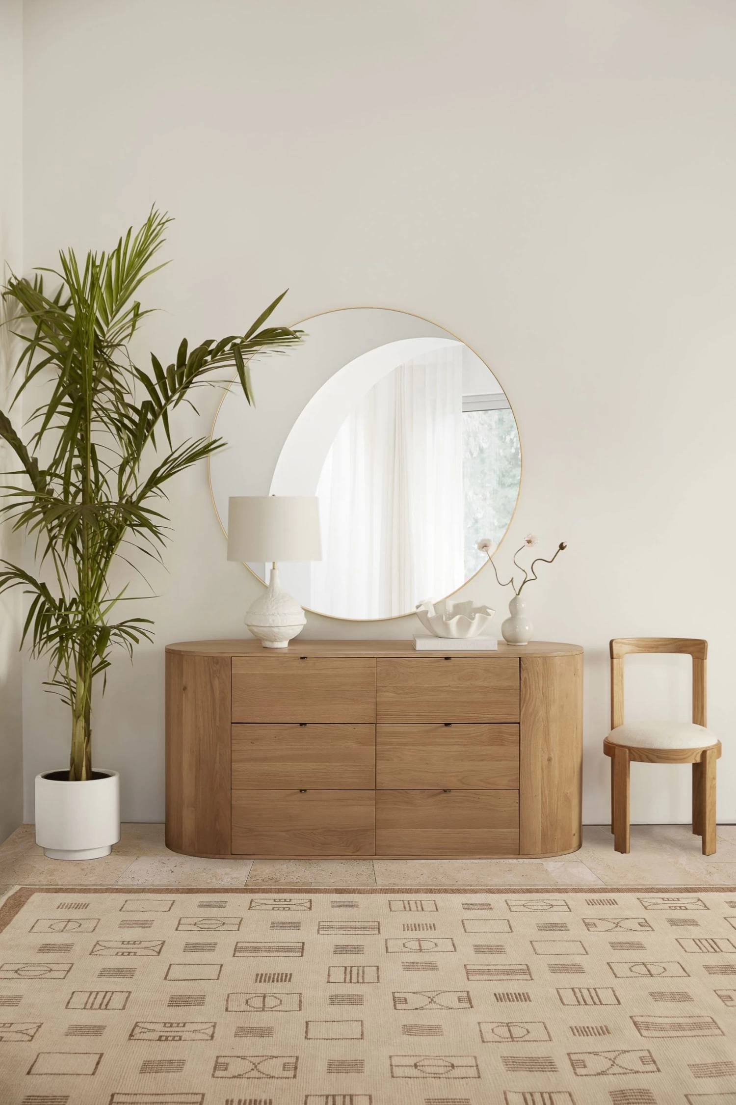 Sometimes simple is best. This large circular mirror is the perfect way to add style and make your space feel larger, without distracting from your statement pieces.