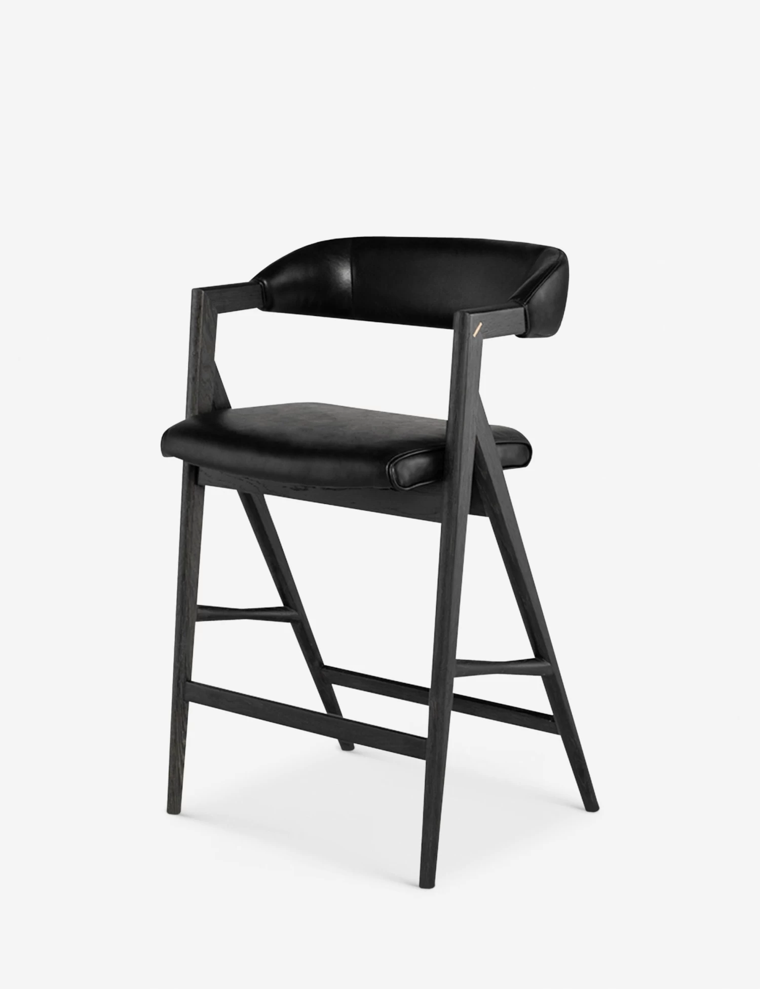 This wooden bar stool brings a mid-century modern look to your space, thanks to its angular, tapered legs, leather-upholstered seat cushion and a floating back design.