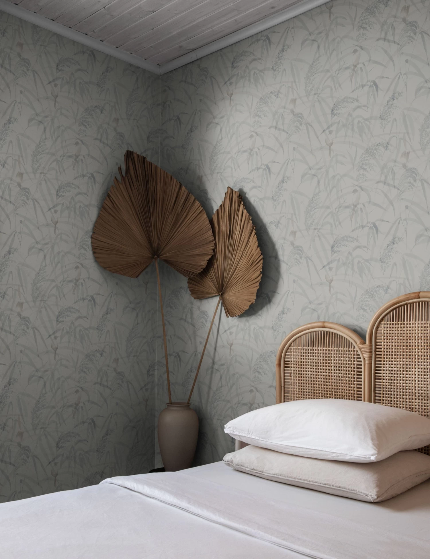 Add some fresh appeal to the room with this botanical wallpaper design. A subtle palette brings the natural scene to life, with birds blending into reeds and leaves in a tonal field. With its soft coloring, this home wallpaper is a great way to layer in a graphic element with versatile styling appeal.