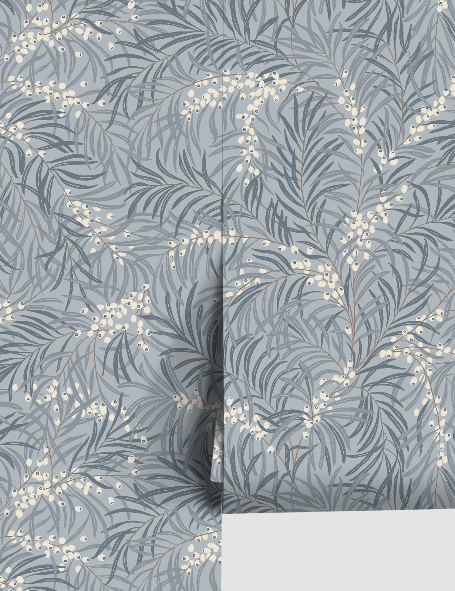 Create a lush depth in your space with this botanical wallpaper. The print features sea buckthorn shrubs packed with berries in a densely layered motif. The leaves resemble beautiful palm-like plumes, offering a vibrant wallpaper you can style from entryway to bath.
