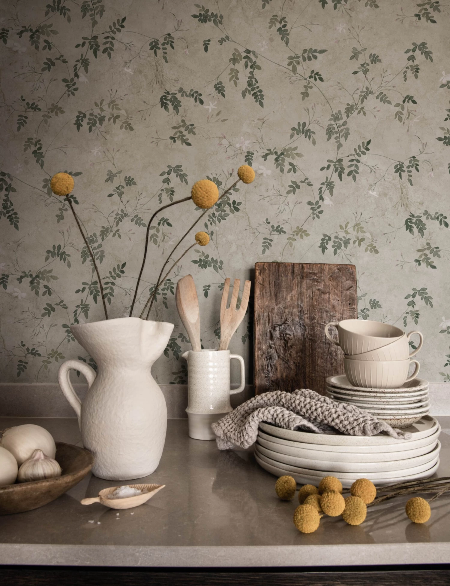 Layer character and texture into your decor with this beautiful home wallpaper design. Jasmine sprigs twine up a stucco-inspired backdrop creating a timeless wallpaper with always fresh appeal.