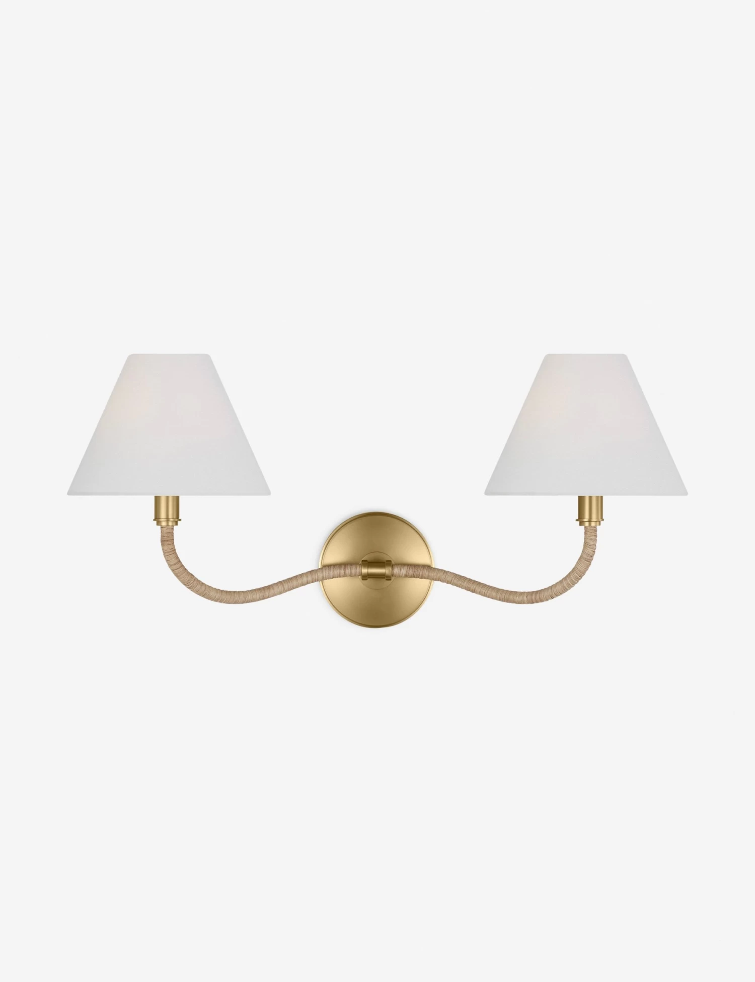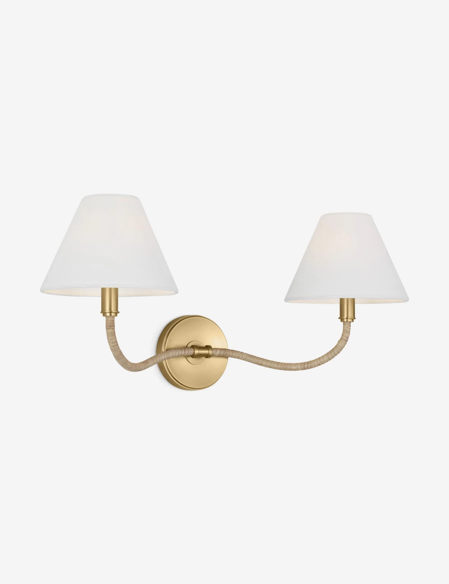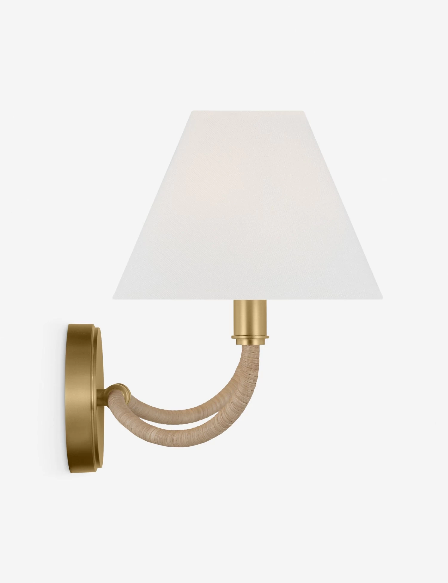 Swanner offers a refined design with a touch of coastal texture. The sconce’s burnished brass frame is wrapped in natural fibers and topped with classic linen shades, bringing a transitional warmth to the subtle curving form. This sconce light offers a balanced accent, ready to bring your look together.