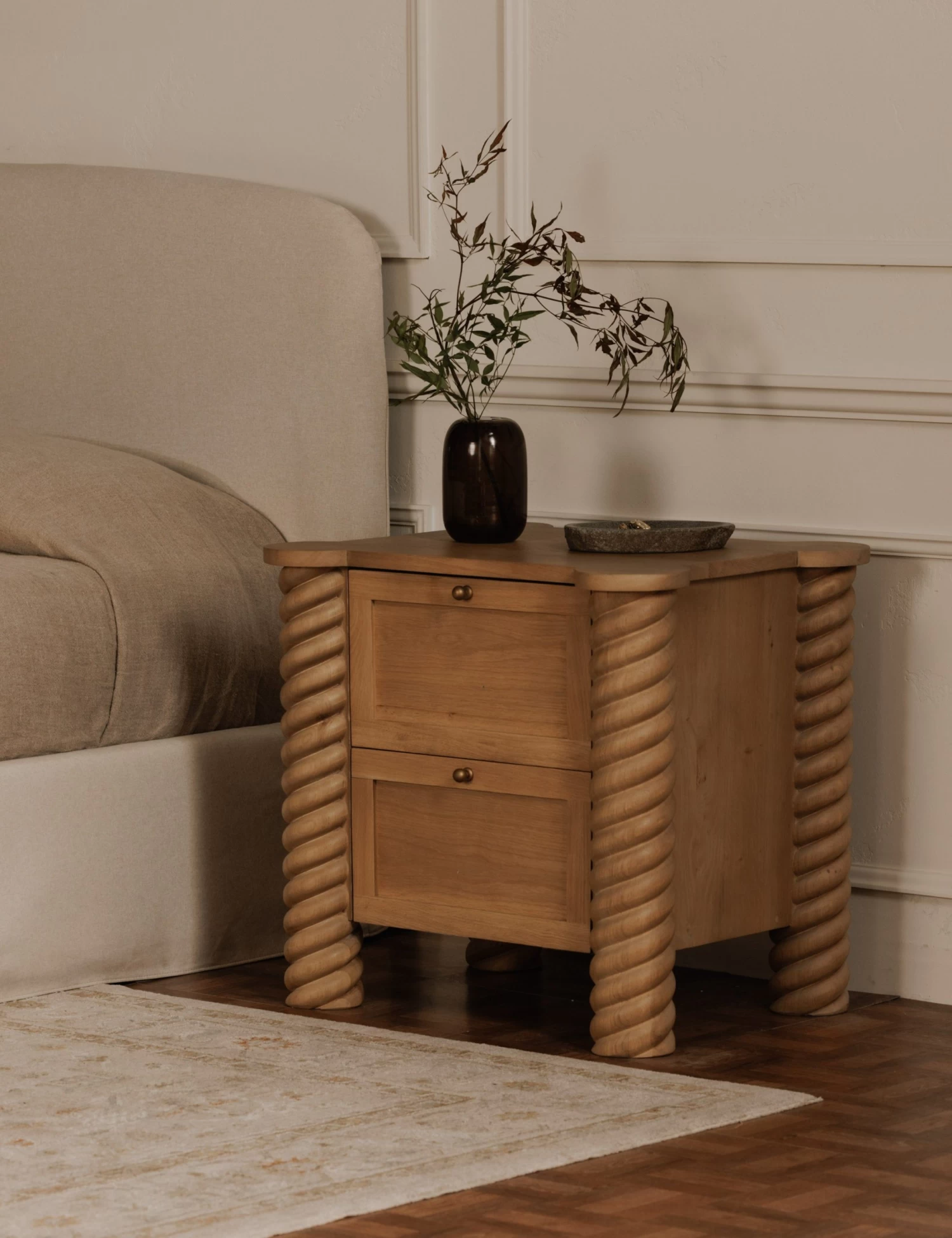 The Treccia nightstand embodies a contemporary reinterpretation of classical aesthetics, distinguished by its intricate turned and braided details. The nightstand features exaggerated, elegantly detailed legs, presenting a bold modern twist while ensuring practicality. Its design is visually appealing while creating a welcoming, uncluttered space for everyday use.