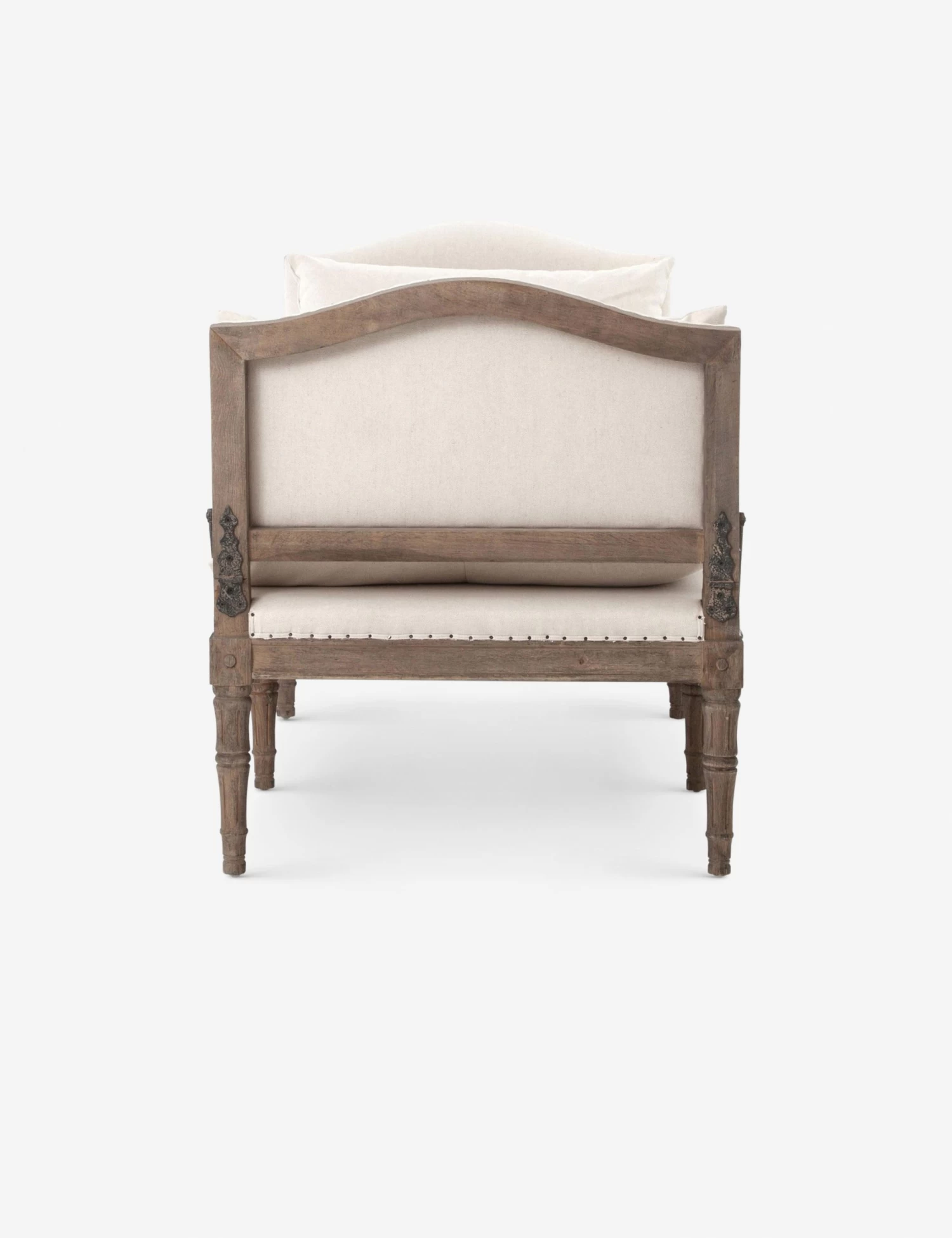With a touch of old-world style this charming chaise features carved legs and a distressed wood frame. The ivory cushions soften the look, while nailhead trim and metal hardware bring an industrial influence.
