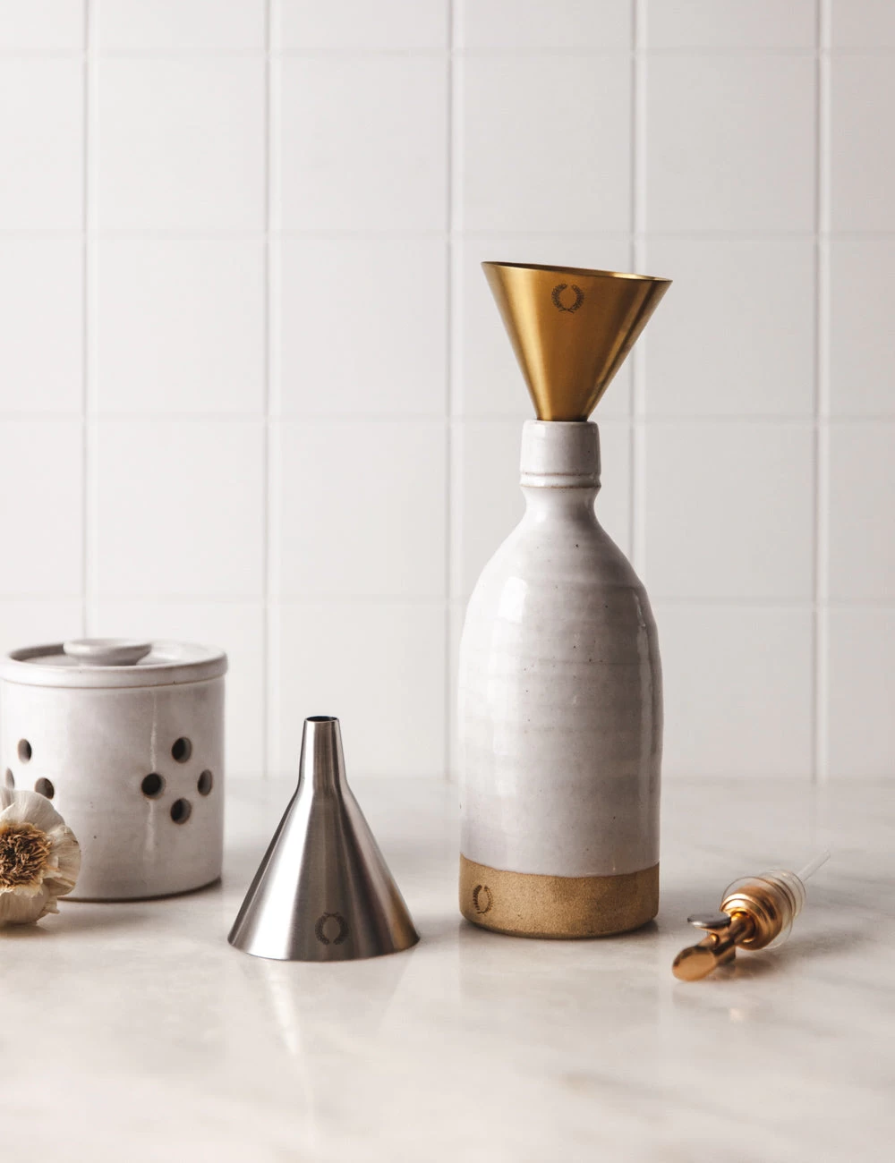 Vermont-based studio Farmhouse Pottery creates handcrafted accents and table essentials with rustic charm. A funnel is a versatile essential for a seamless home kitchen. From oils and soap to spices and grains, this chic funnel offers the perfect blend of function and style, letting you refill and transfer staples with effortless appeal.