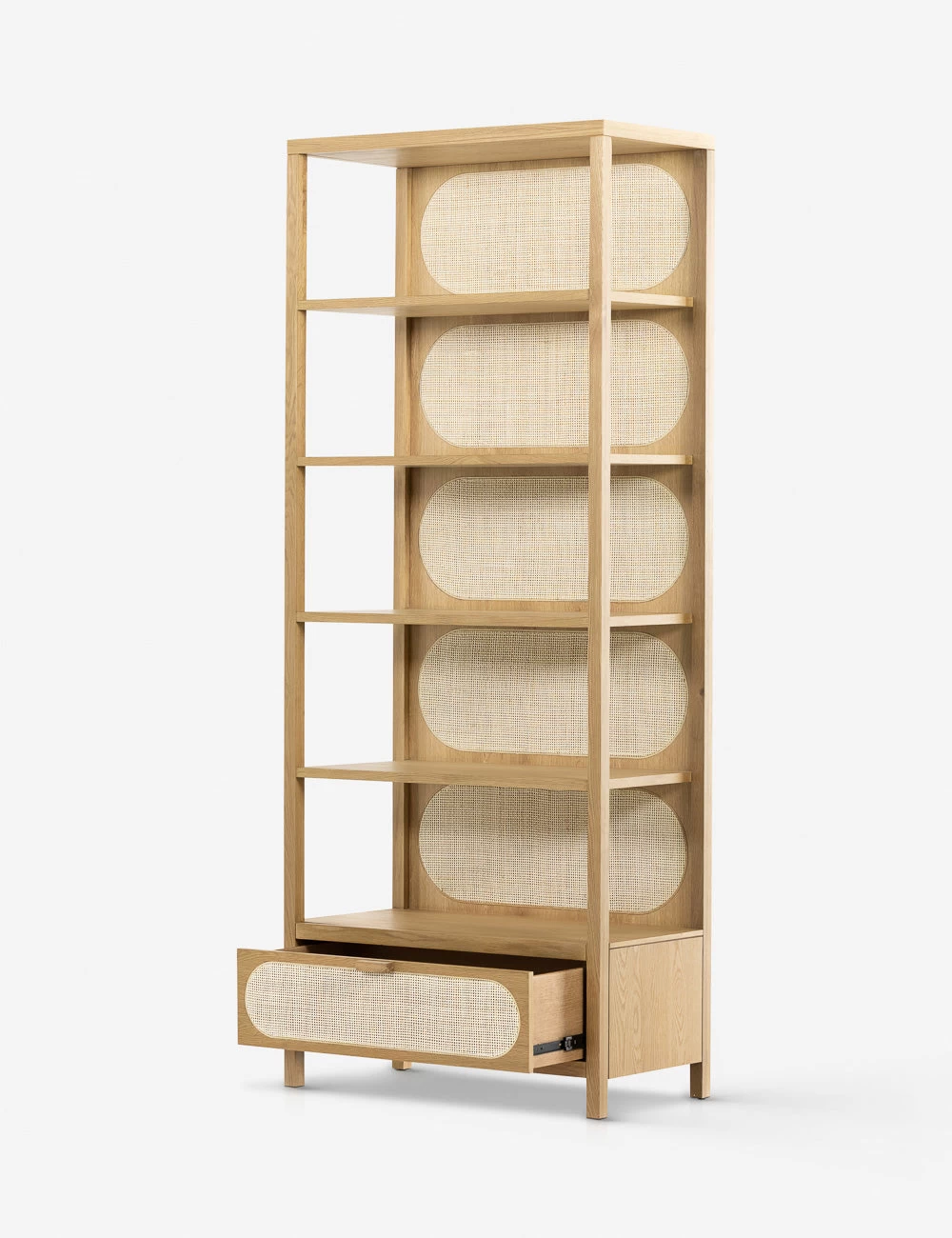Honey-finished oak and oval-shaped cane paneling inspire transitional appeal in the Verna Bookcase. With a spacious lower drawer and clean, streamlined frame, this bookcase offers effortless warmth with plenty of room for storage and display.