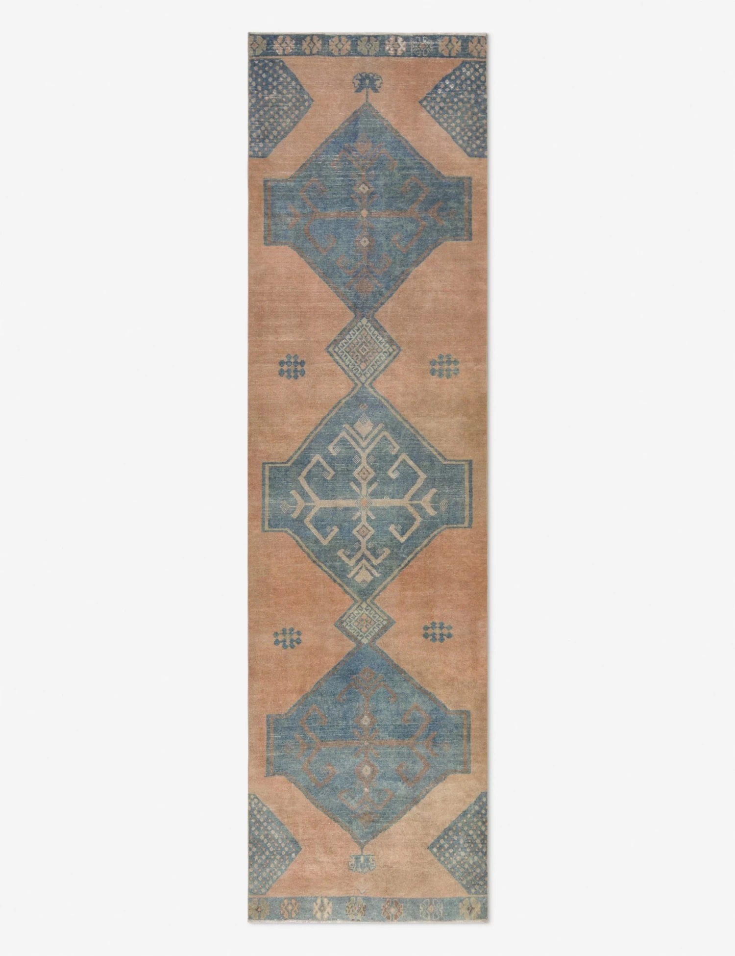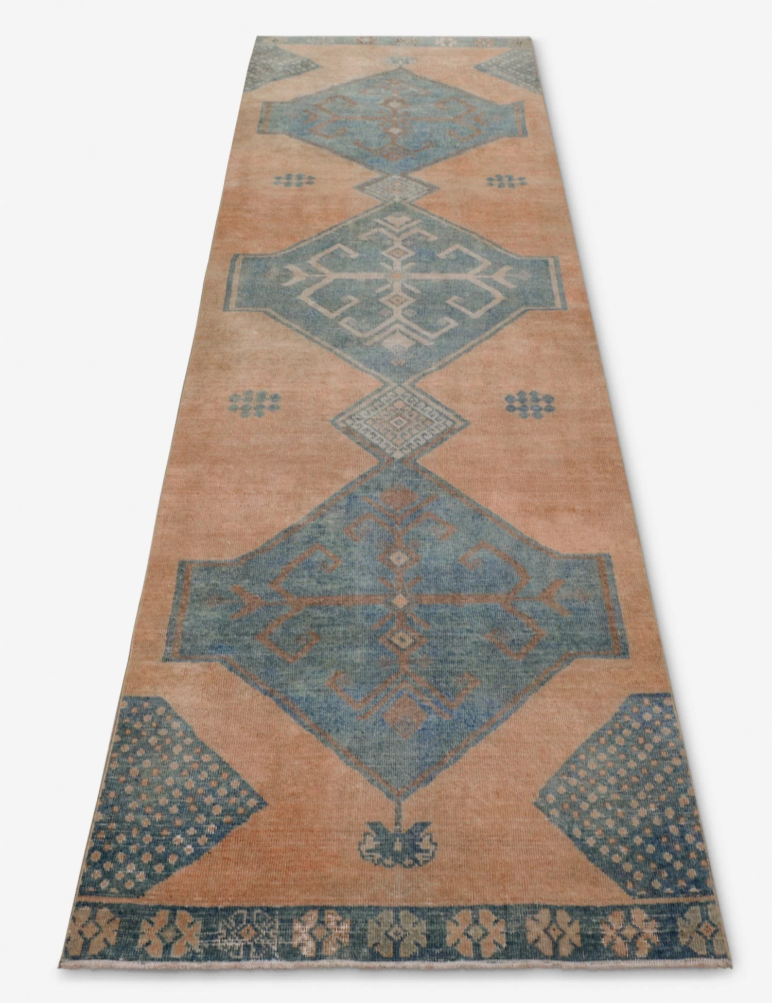 A vintage wool rug instantly transforms your space—adding warmth and rich color, all while feeling like a discovery from far-flung travels. Made entirely by hand in Turkey, this hand-knotted floor rug is truly an investment for your home, a stunning one-of-a-kind centerpiece to build and layer your style onto. The runner size is ideal for hallways or in the kitchen.
