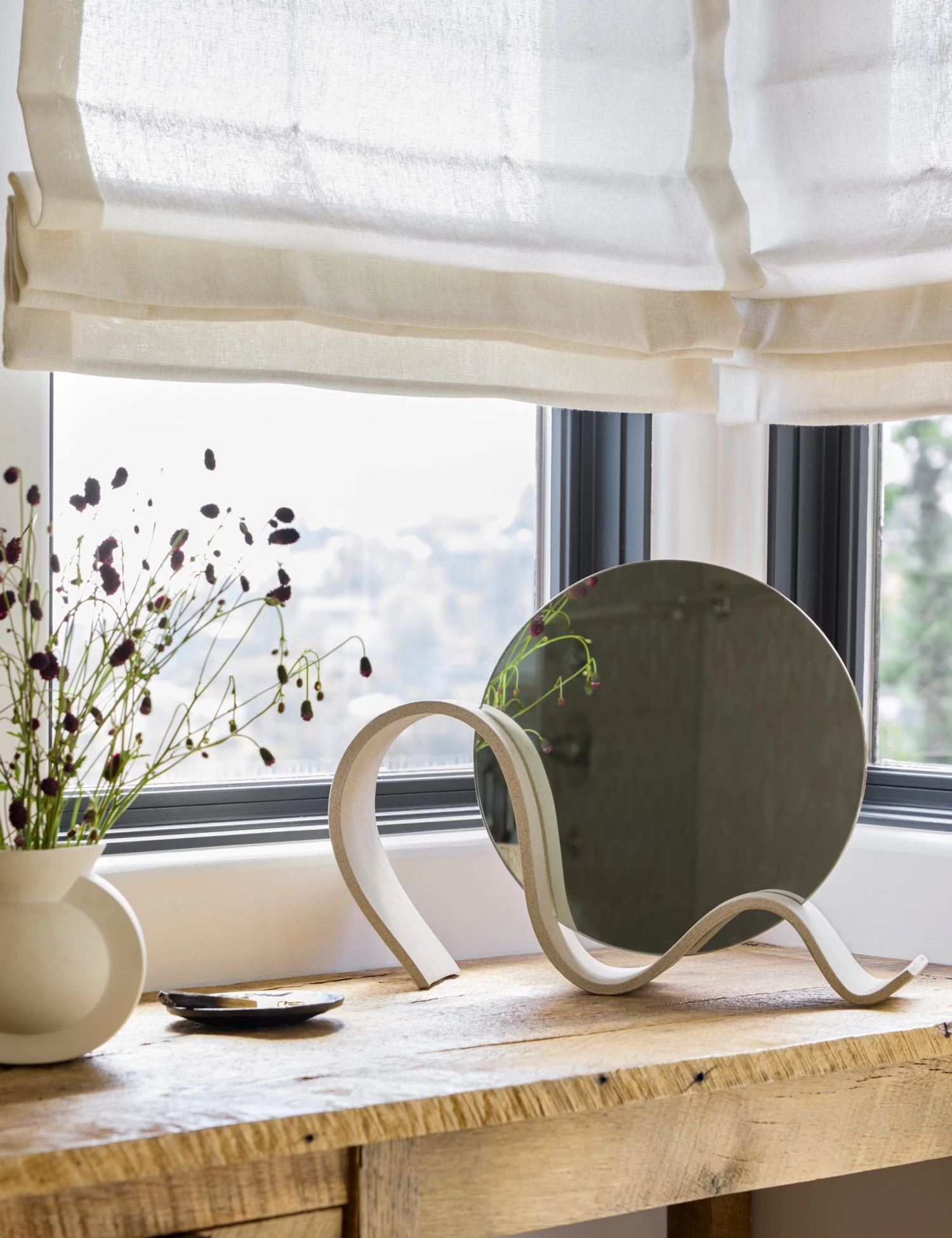 SIN is a Brooklyn-based brand that offers beautiful, handmade pieces designed with intention. Inspired by the gentle movement of a calm sea, the Wavee table mirror is the perfect way to layer drama and depth into your tabletop decor. The 12″ round mirror fits artfully into the ceramic holder creating a bright, sculptural feature perfect for an entryway or console table.