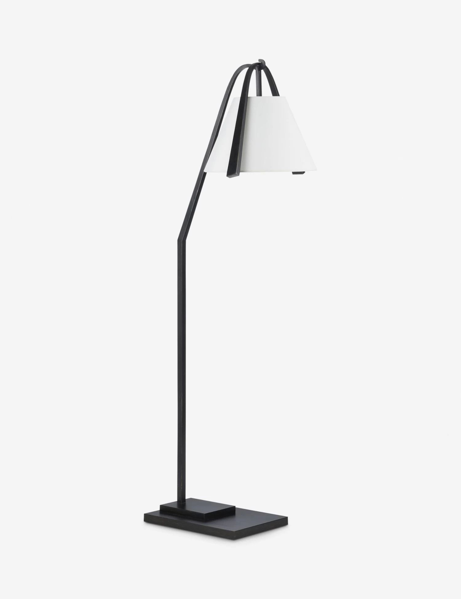 The Yang floor lamp is a study in modern elegance. With a graceful line, the bronze-finished frame curves upward to hold a tapered shade in soft white. On its stacked base, this lamp offers a brilliant reading light with sculptural poise.