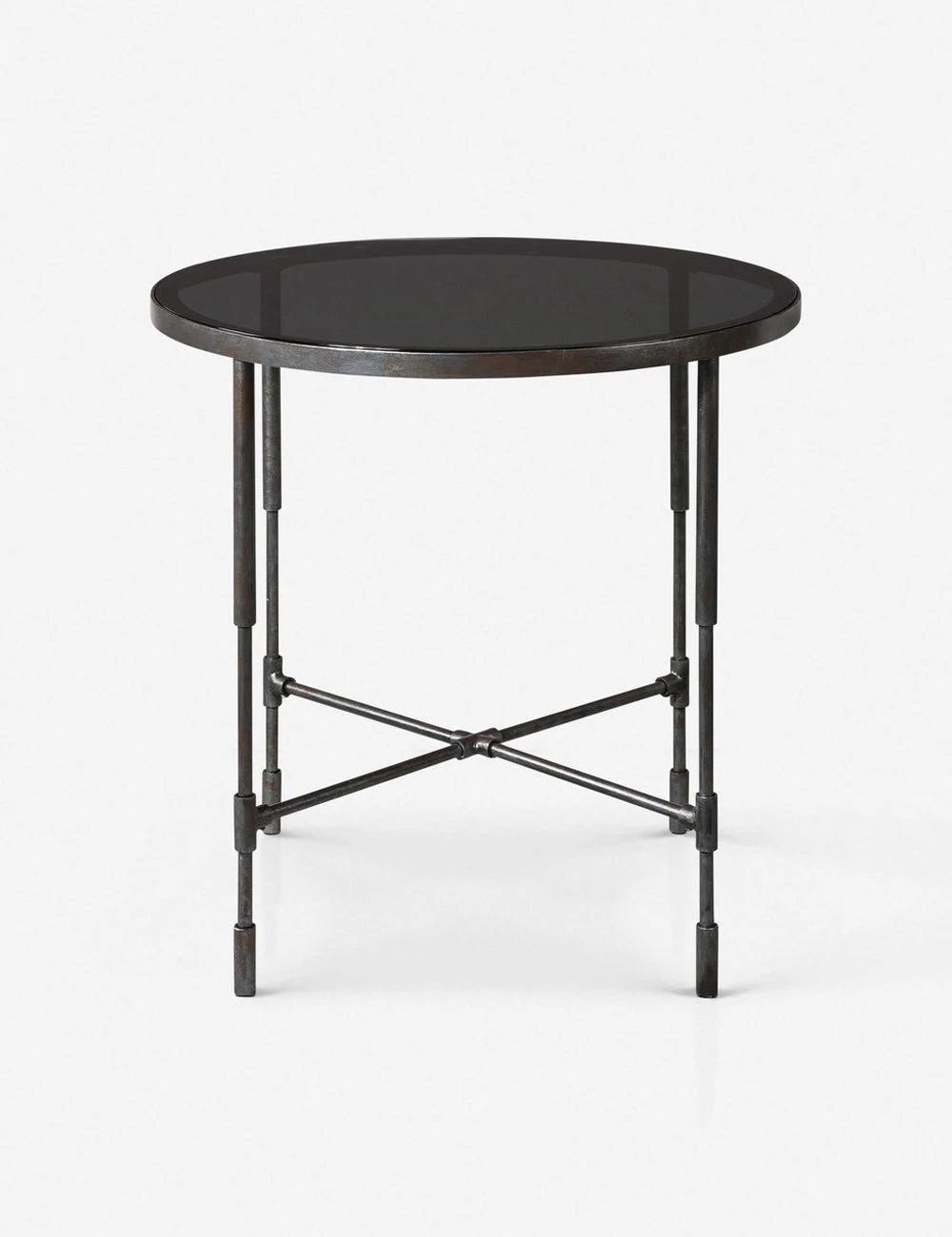 Featuring a smoked glass top and a distressed metal base, this round accent table is perfect for industrial-inspired spaces.