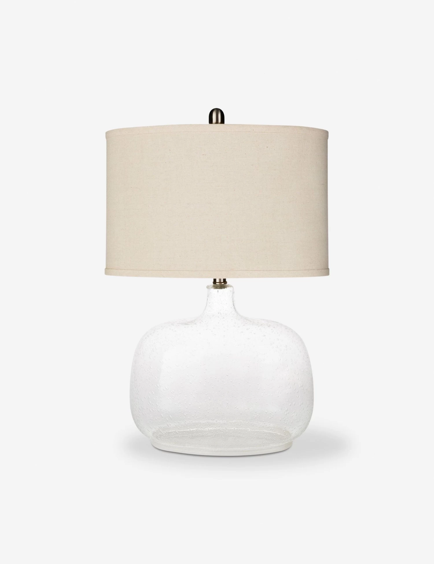 This chic table lamp features a transparent glass base with bubbles for a transitional look. The beige drum shade keeps the look neutral enough for any living room or bedroom.